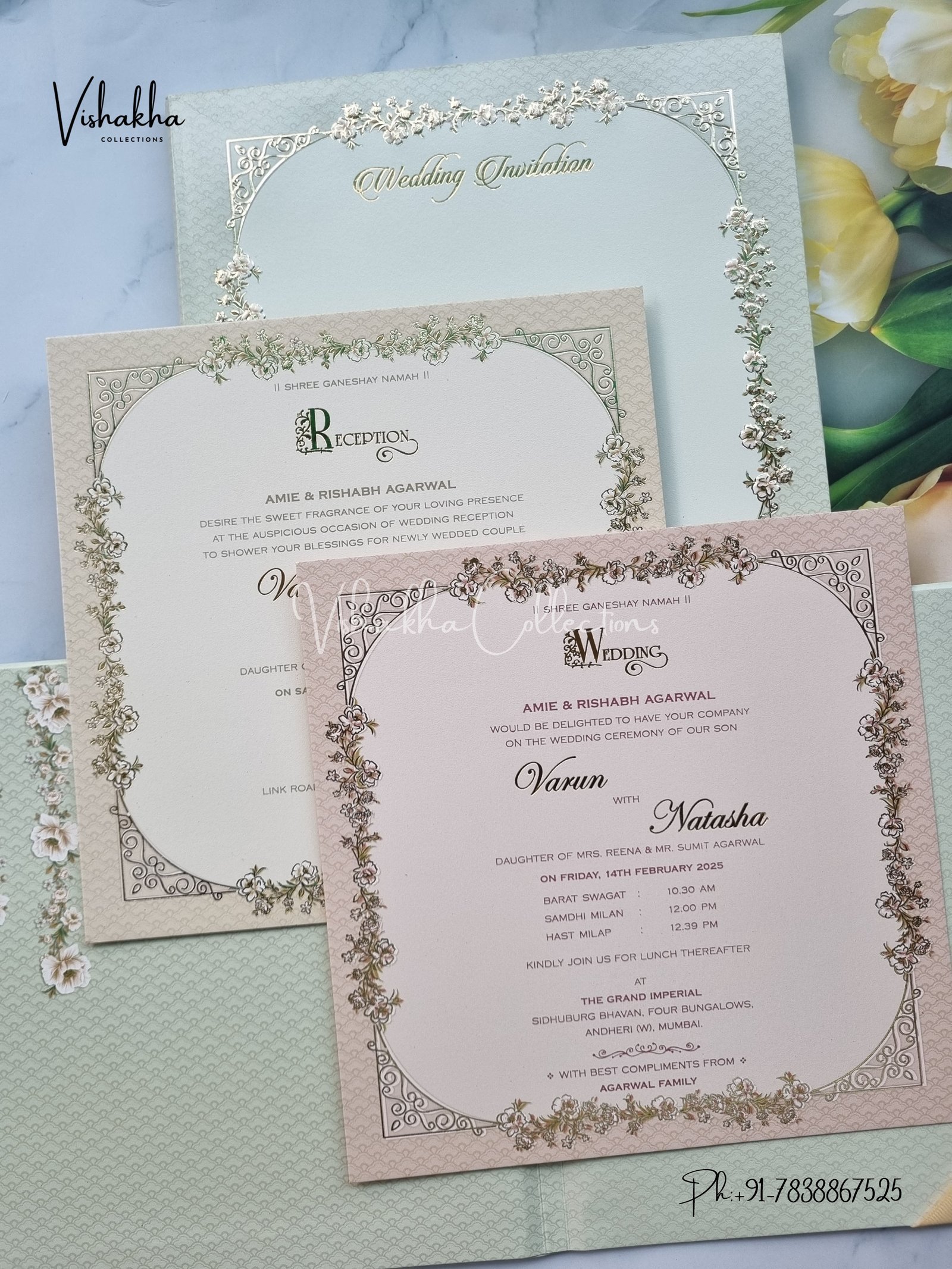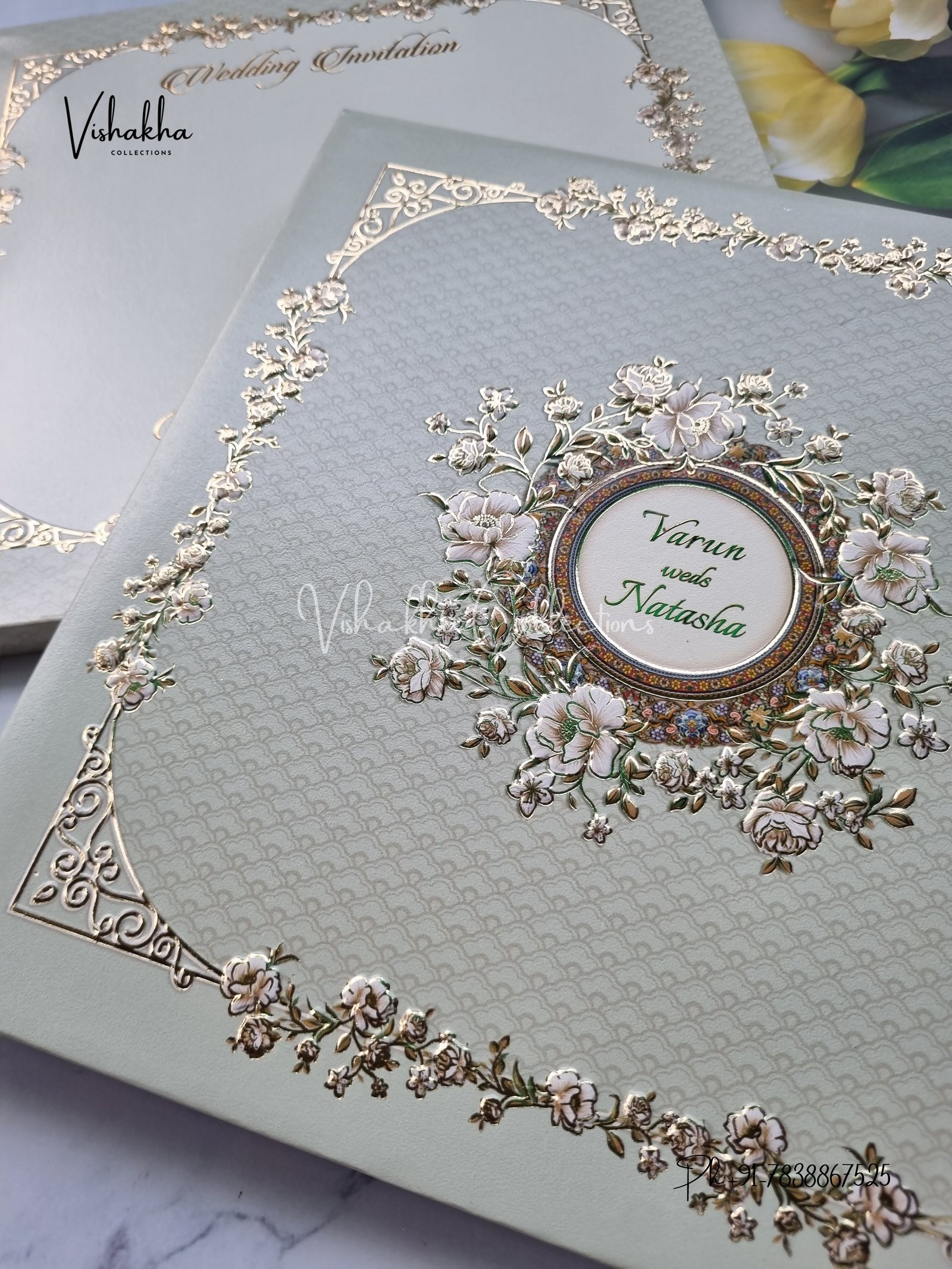 Vishakha Collections presents you beautiful luxury wedding invitation cards with all latest designs and the latest variety. Its just not a wedding invitation card but a beautiful feeling of love and relationship it carries for you. Beautifully printed and packed with a bundle of love. if you like it, dont think again, just go for it.If you are worrying about the quality of the product, send your doubts to us. We are here to help you. If you want in wholesale or bulk, dont forget to contact us.