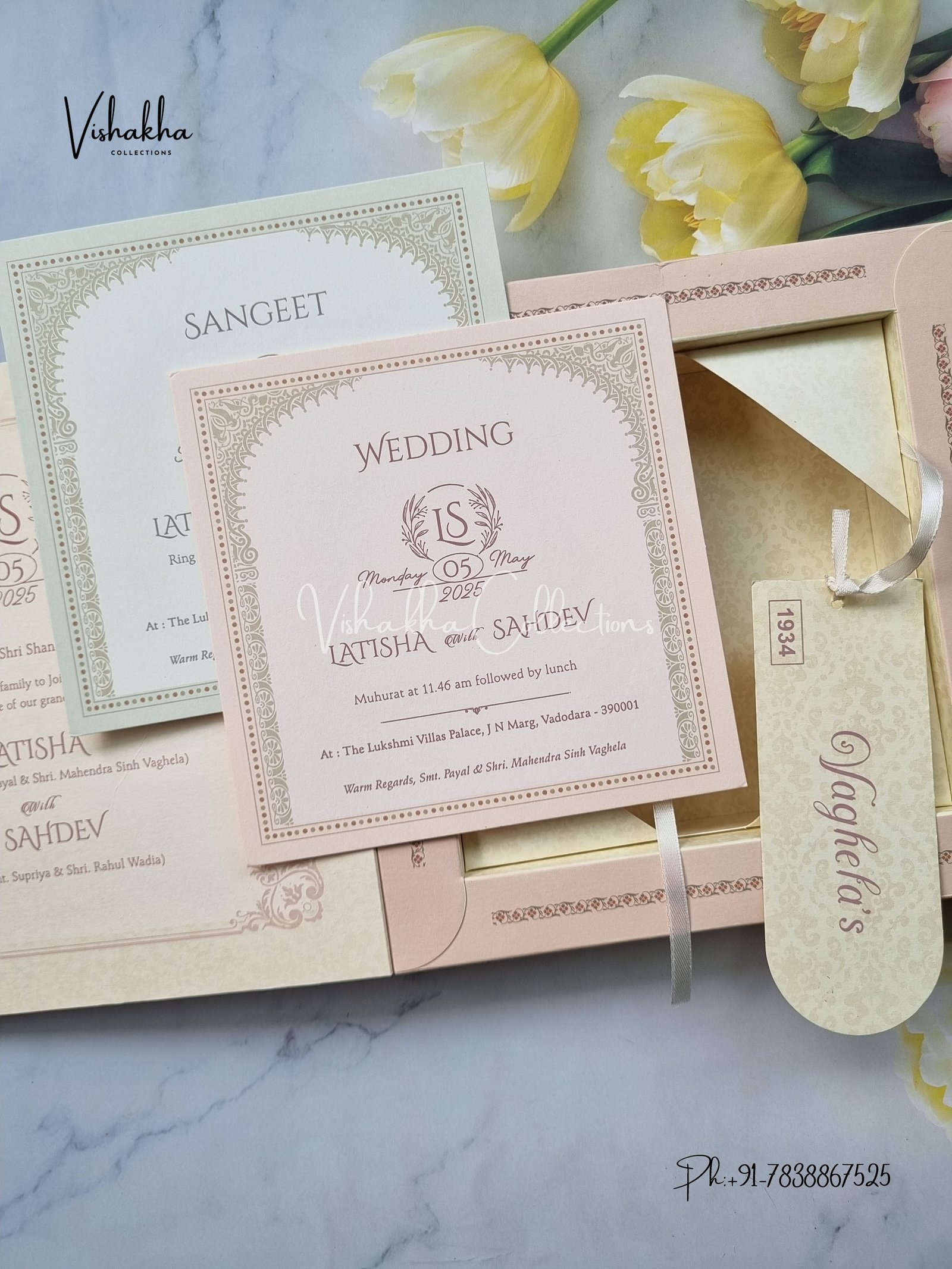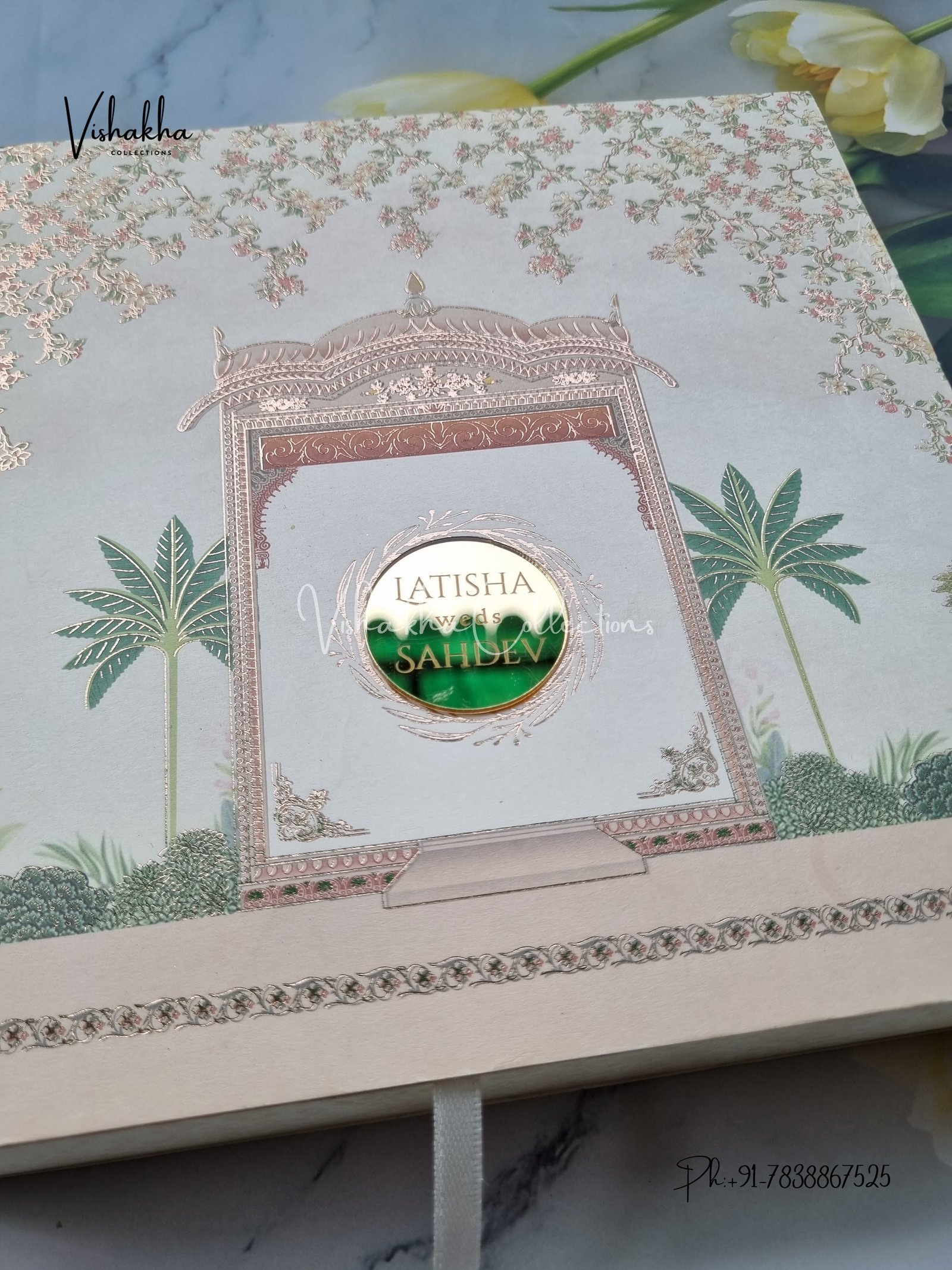 Vishakha Collections presents you beautiful luxury wedding invitation cards with all latest designs and the latest variety. Its just not a wedding invitation card but a beautiful feeling of love and relationship it carries for you. Beautifully printed and packed with a bundle of love. if you like it, dont think again, just go for it.If you are worrying about the quality of the product, send your doubts to us. We are here to help you. If you want in wholesale or bulk, dont forget to contact us.