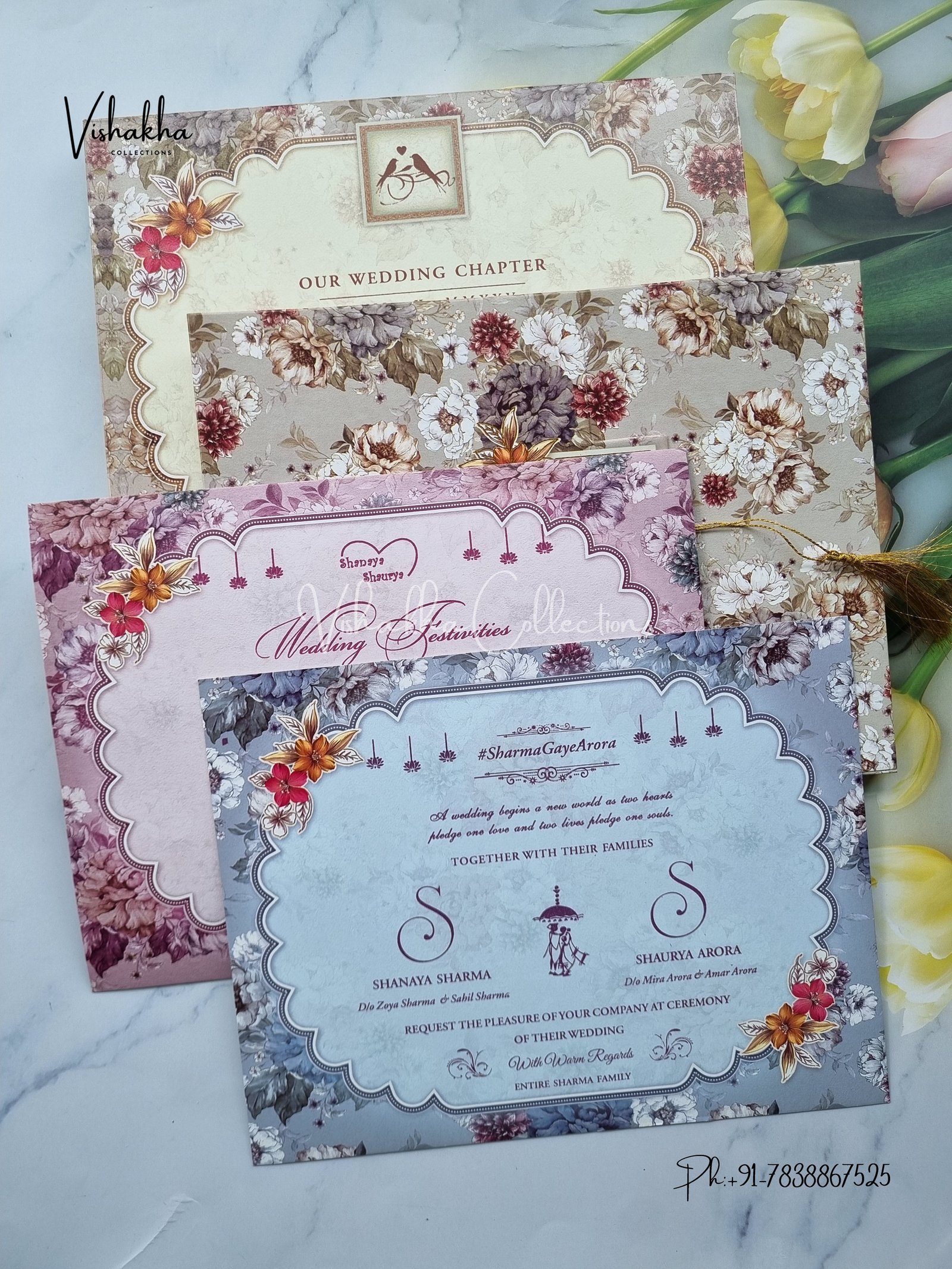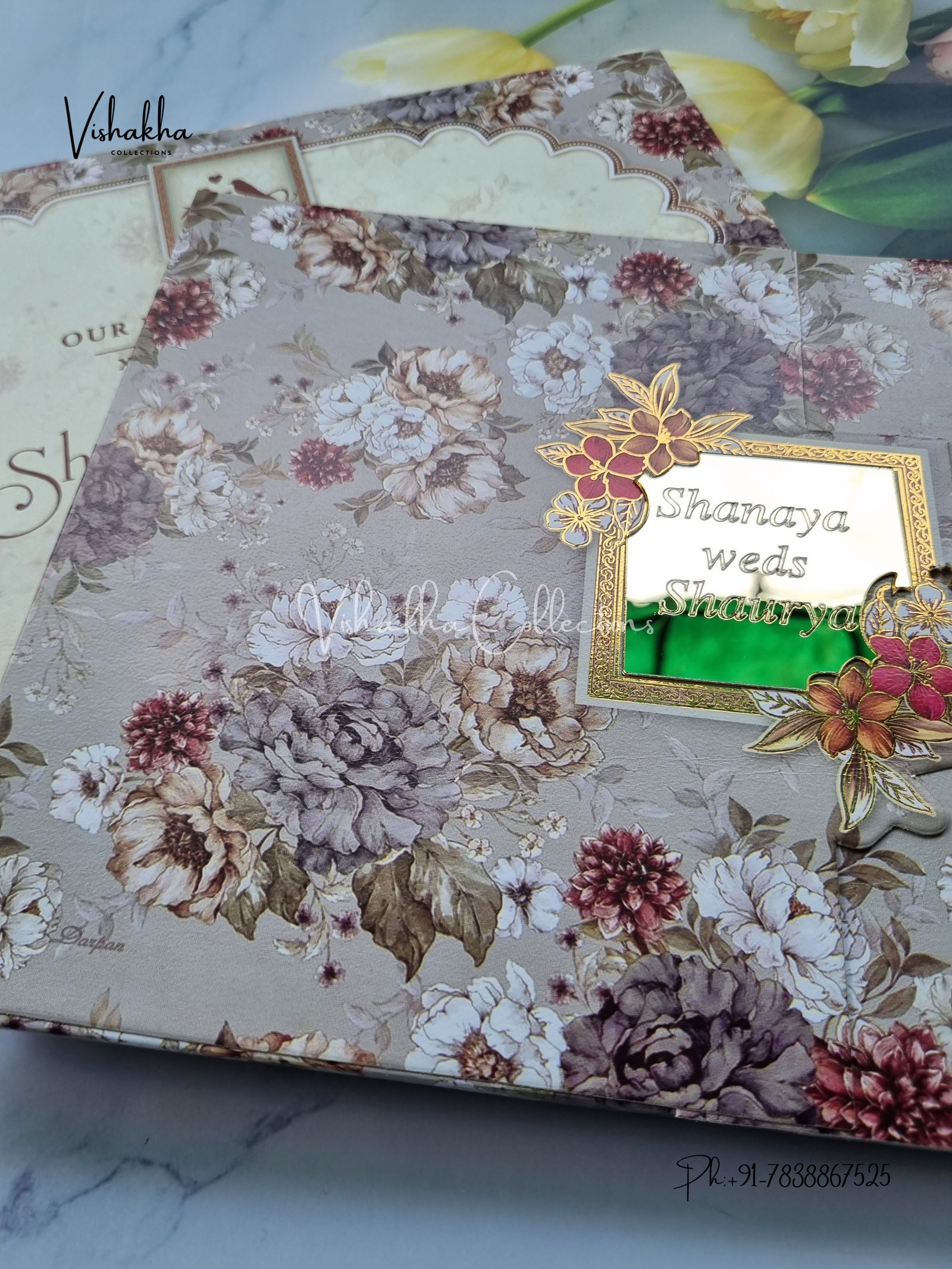 Vishakha Collections presents you beautiful luxury wedding invitation cards with all latest designs and the latest variety. Its just not a wedding invitation card but a beautiful feeling of love and relationship it carries for you. Beautifully printed and packed with a bundle of love. if you like it, dont think again, just go for it.If you are worrying about the quality of the product, send your doubts to us. We are here to help you. If you want in wholesale or bulk, dont forget to contact us.