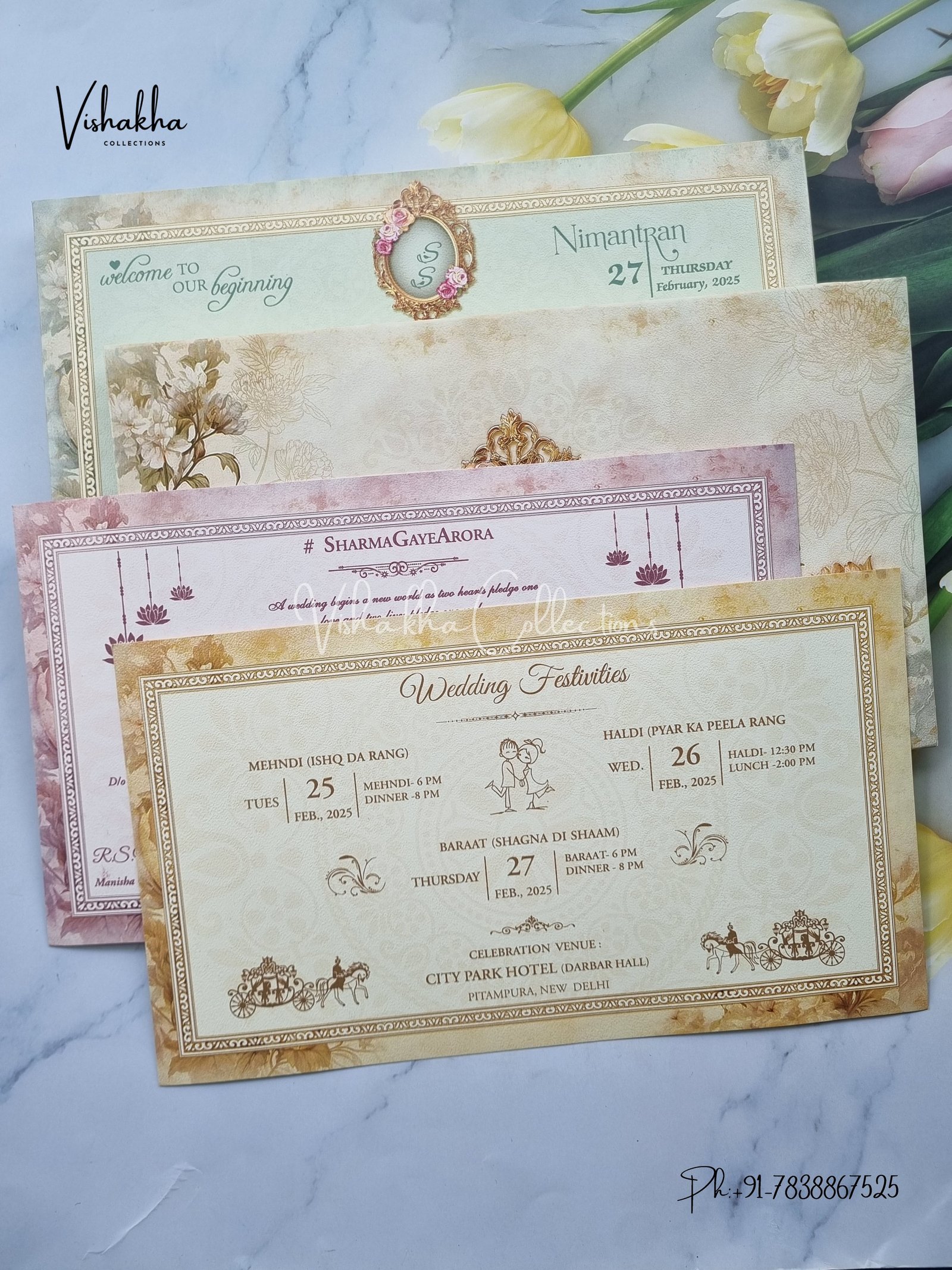 Vishakha Collections presents you beautiful luxury wedding invitation cards with all latest designs and the latest variety. Its just not a wedding invitation card but a beautiful feeling of love and relationship it carries for you. Beautifully printed and packed with a bundle of love. if you like it, dont think again, just go for it.If you are worrying about the quality of the product, send your doubts to us. We are here to help you. If you want in wholesale or bulk, dont forget to contact us.