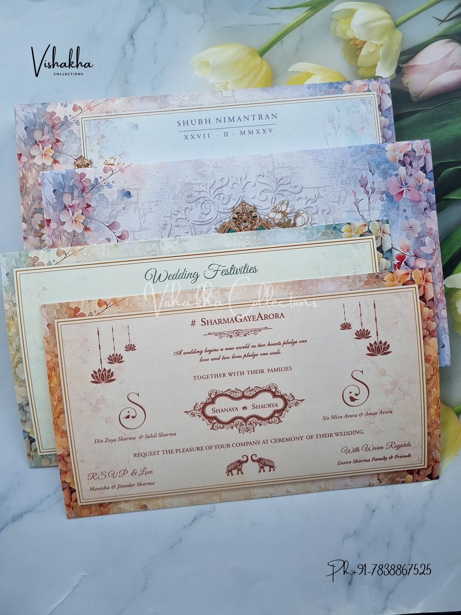 Vishakha Collections presents you beautiful luxury wedding invitation cards with all latest designs and the latest variety. Its just not a wedding invitation card but a beautiful feeling of love and relationship it carries for you. Beautifully printed and packed with a bundle of love. if you like it, dont think again, just go for it.If you are worrying about the quality of the product, send your doubts to us. We are here to help you. If you want in wholesale or bulk, dont forget to contact us.