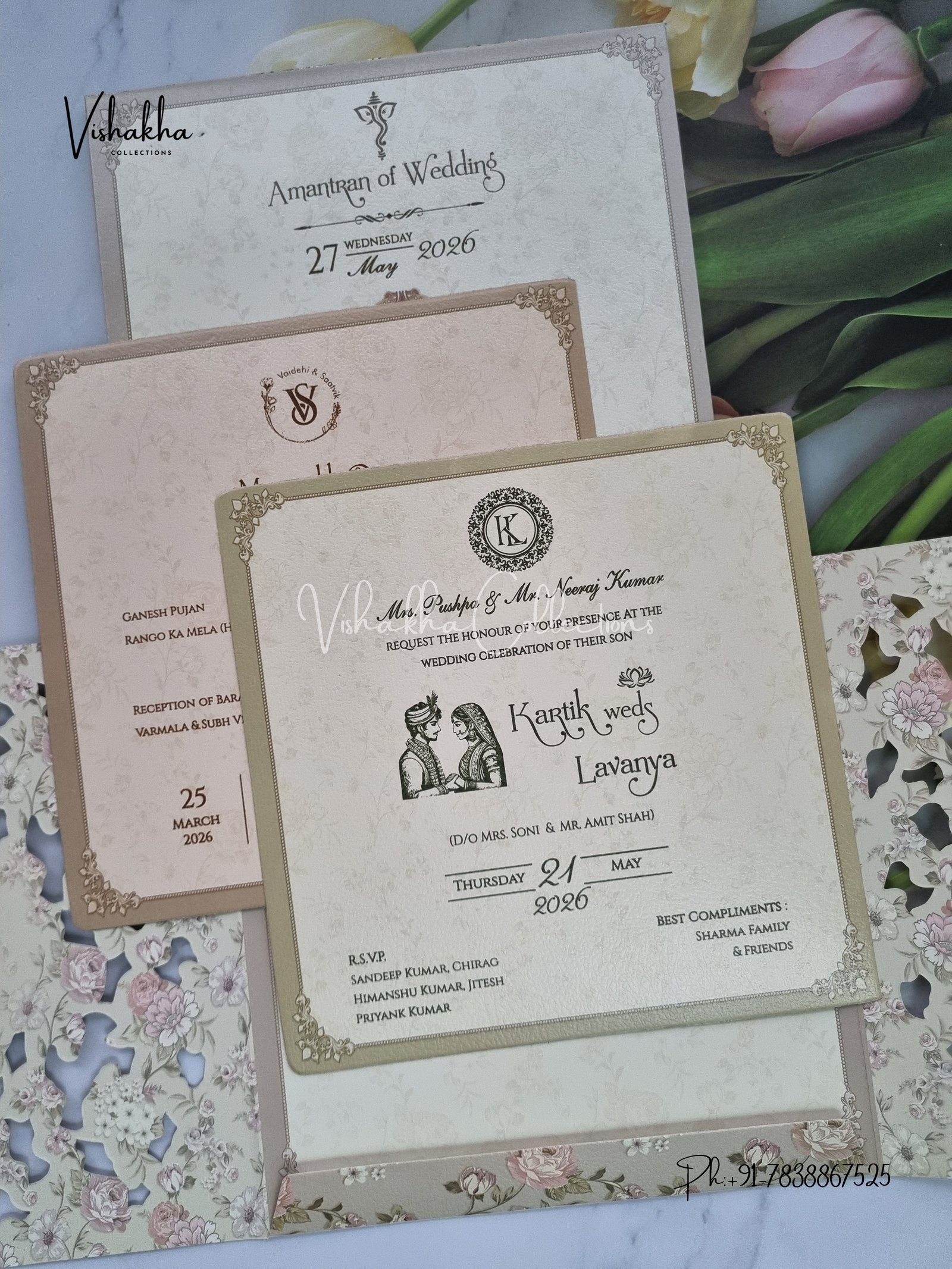 Vishakha Collections presents you beautiful luxury wedding invitation cards with all latest designs and the latest variety. Its just not a wedding invitation card but a beautiful feeling of love and relationship it carries for you. Beautifully printed and packed with a bundle of love. if you like it, dont think again, just go for it.If you are worrying about the quality of the product, send your doubts to us. We are here to help you. If you want in wholesale or bulk, dont forget to contact us.