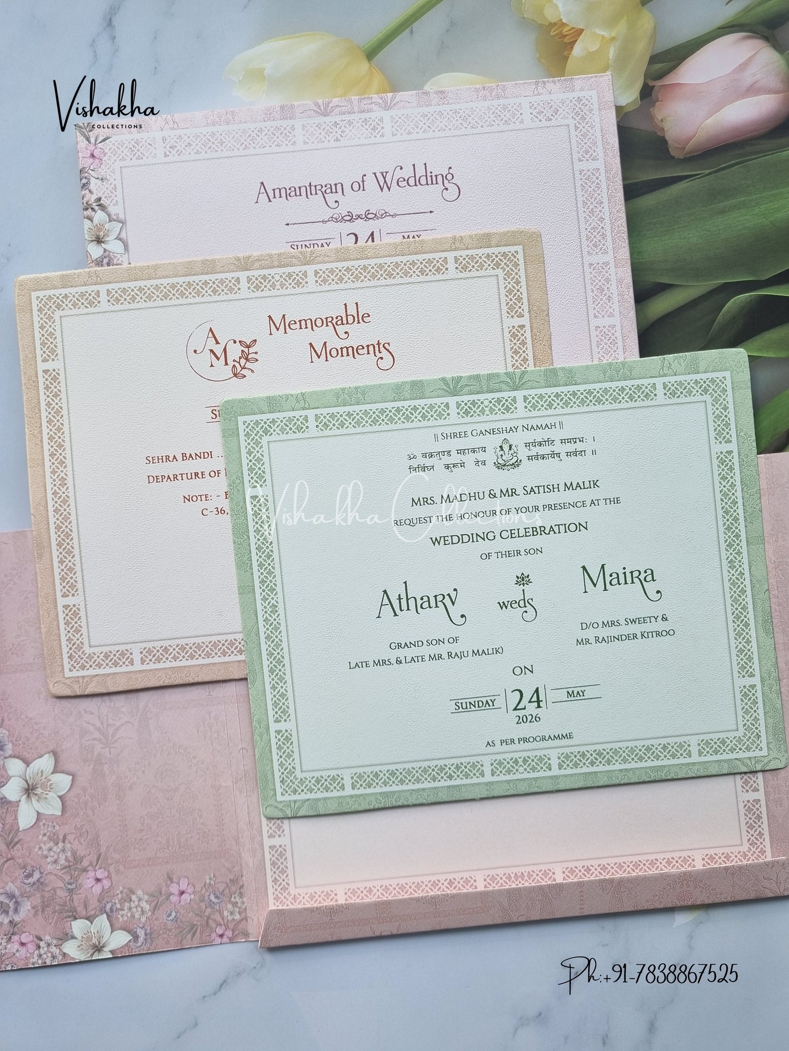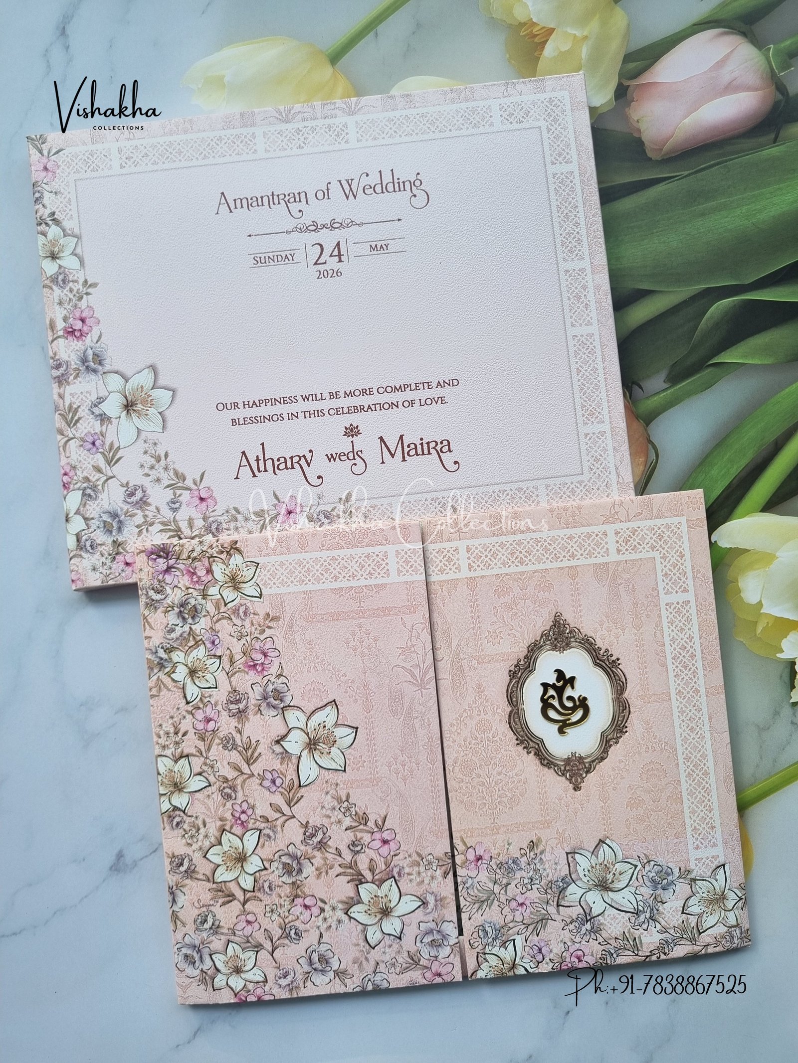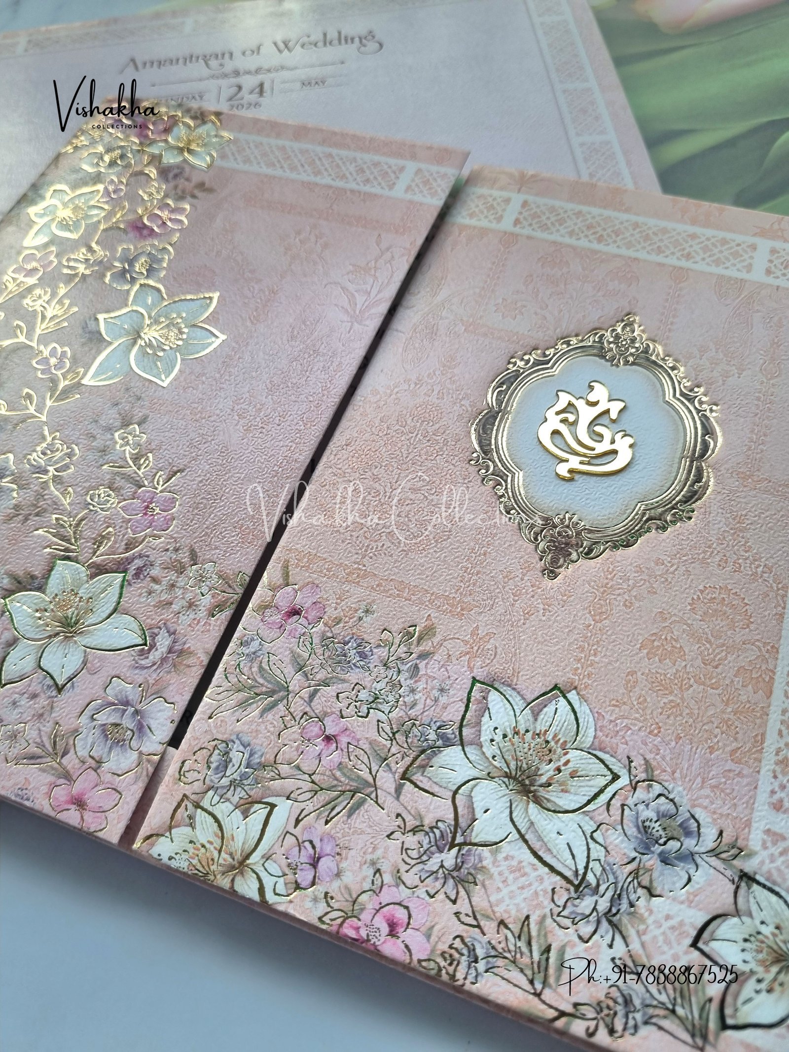 Vishakha Collections presents you beautiful luxury wedding invitation cards with all latest designs and the latest variety. Its just not a wedding invitation card but a beautiful feeling of love and relationship it carries for you. Beautifully printed and packed with a bundle of love. if you like it, dont think again, just go for it.If you are worrying about the quality of the product, send your doubts to us. We are here to help you. If you want in wholesale or bulk, dont forget to contact us.