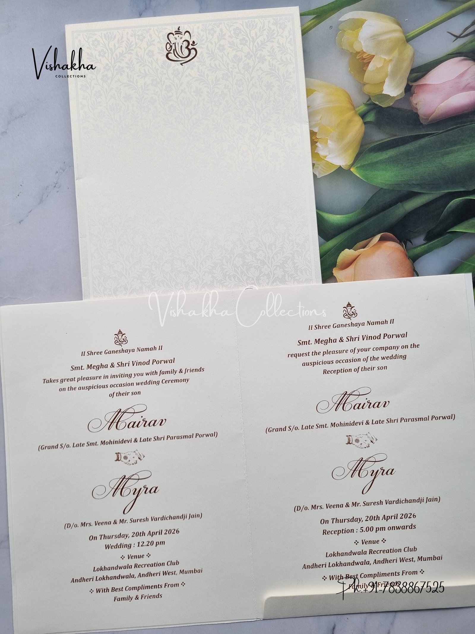 Vishakha Collections presents you beautiful luxury wedding invitation cards with all latest designs and the latest variety. Its just not a wedding invitation card but a beautiful feeling of love and relationship it carries for you. Beautifully printed and packed with a bundle of love. if you like it, dont think again, just go for it.If you are worrying about the quality of the product, send your doubts to us. We are here to help you. If you want in wholesale or bulk, dont forget to contact us.