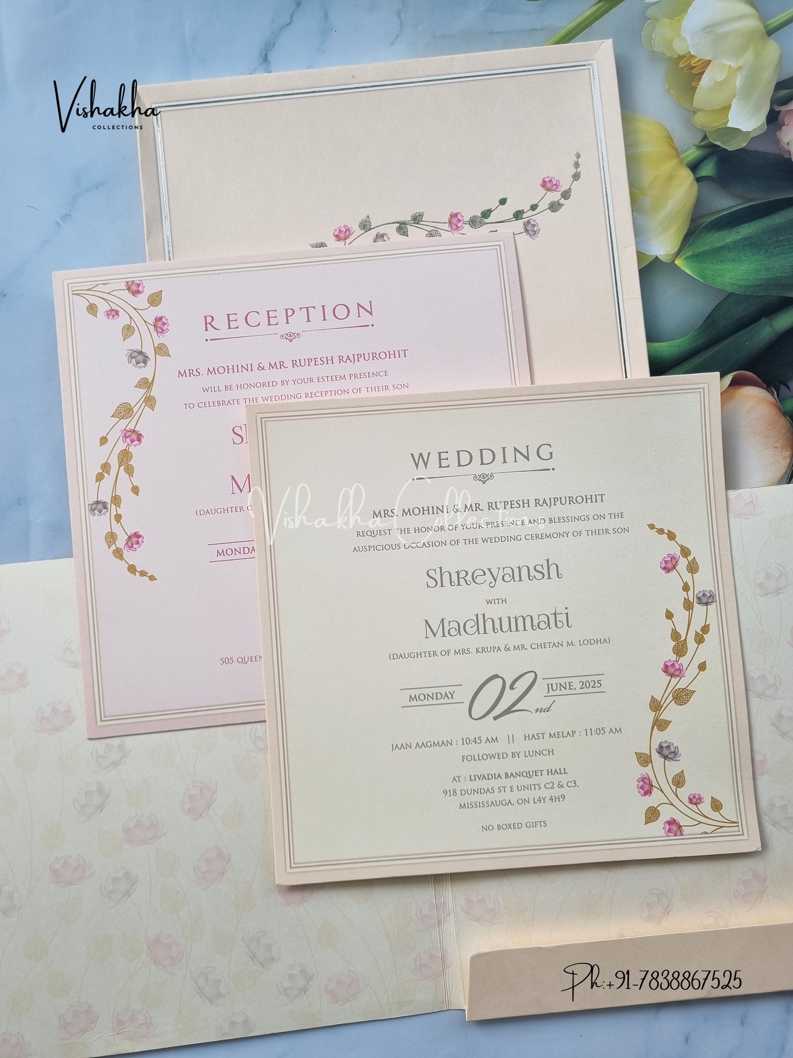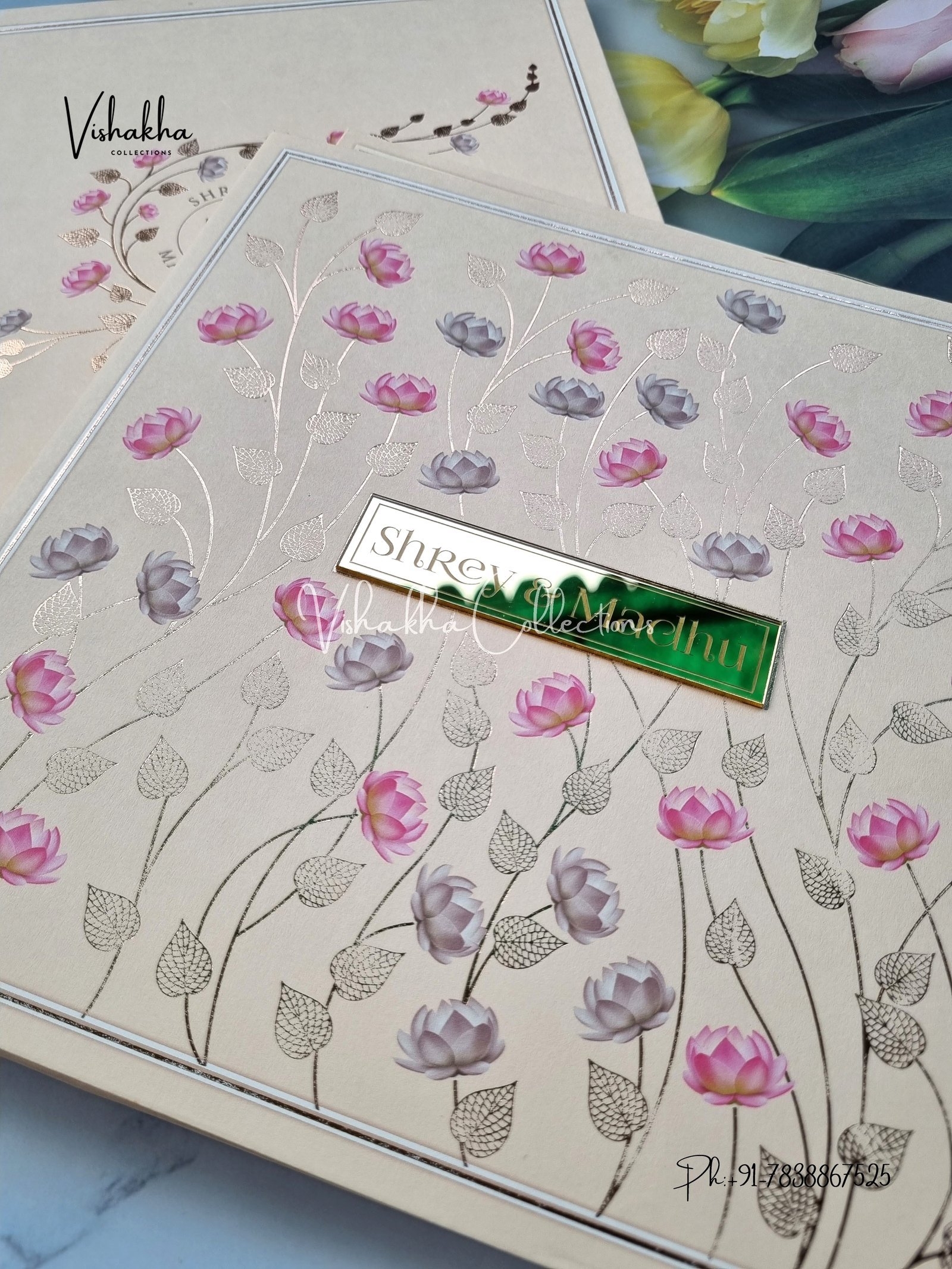 Vishakha Collections presents you beautiful luxury wedding invitation cards with all latest designs and the latest variety. Its just not a wedding invitation card but a beautiful feeling of love and relationship it carries for you. Beautifully printed and packed with a bundle of love. if you like it, dont think again, just go for it.If you are worrying about the quality of the product, send your doubts to us. We are here to help you. If you want in wholesale or bulk, dont forget to contact us.