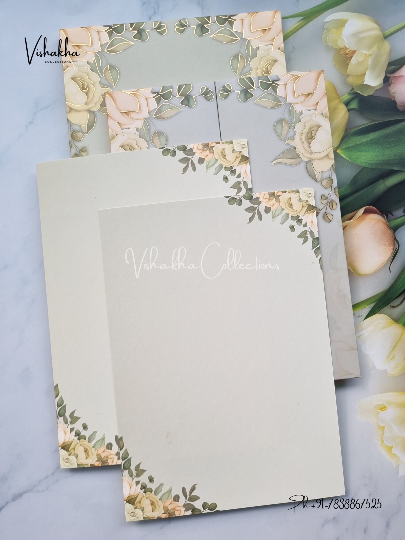 Vishakha Collections presents you beautiful luxury wedding invitation cards with all latest designs and the latest variety. Its just not a wedding invitation card but a beautiful feeling of love and relationship it carries for you. Beautifully printed and packed with a bundle of love. if you like it, dont think again, just go for it.If you are worrying about the quality of the product, send your doubts to us. We are here to help you. If you want in wholesale or bulk, dont forget to contact us.