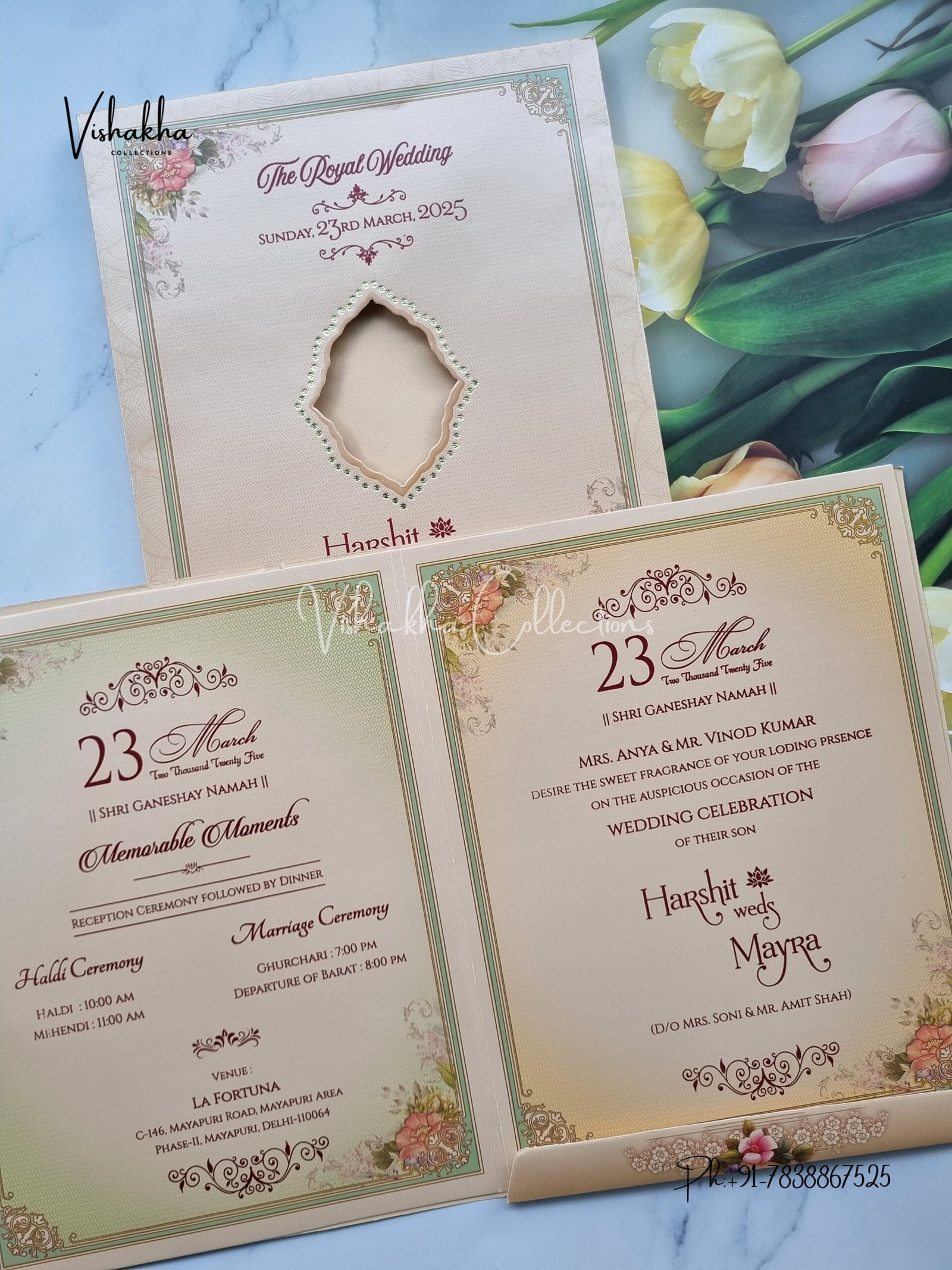 Vishakha Collections presents you beautiful luxury wedding invitation cards with all latest designs and the latest variety. Its just not a wedding invitation card but a beautiful feeling of love and relationship it carries for you. Beautifully printed and packed with a bundle of love. if you like it, dont think again, just go for it.If you are worrying about the quality of the product, send your doubts to us. We are here to help you. If you want in wholesale or bulk, dont forget to contact us.
