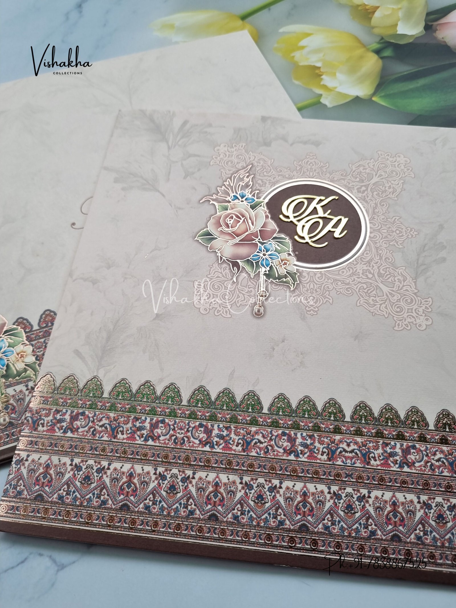 Vishakha Collections presents you beautiful luxury wedding invitation cards with all latest designs and the latest variety. Its just not a wedding invitation card but a beautiful feeling of love and relationship it carries for you. Beautifully printed and packed with a bundle of love. if you like it, dont think again, just go for it.If you are worrying about the quality of the product, send your doubts to us. We are here to help you. If you want in wholesale or bulk, dont forget to contact us.