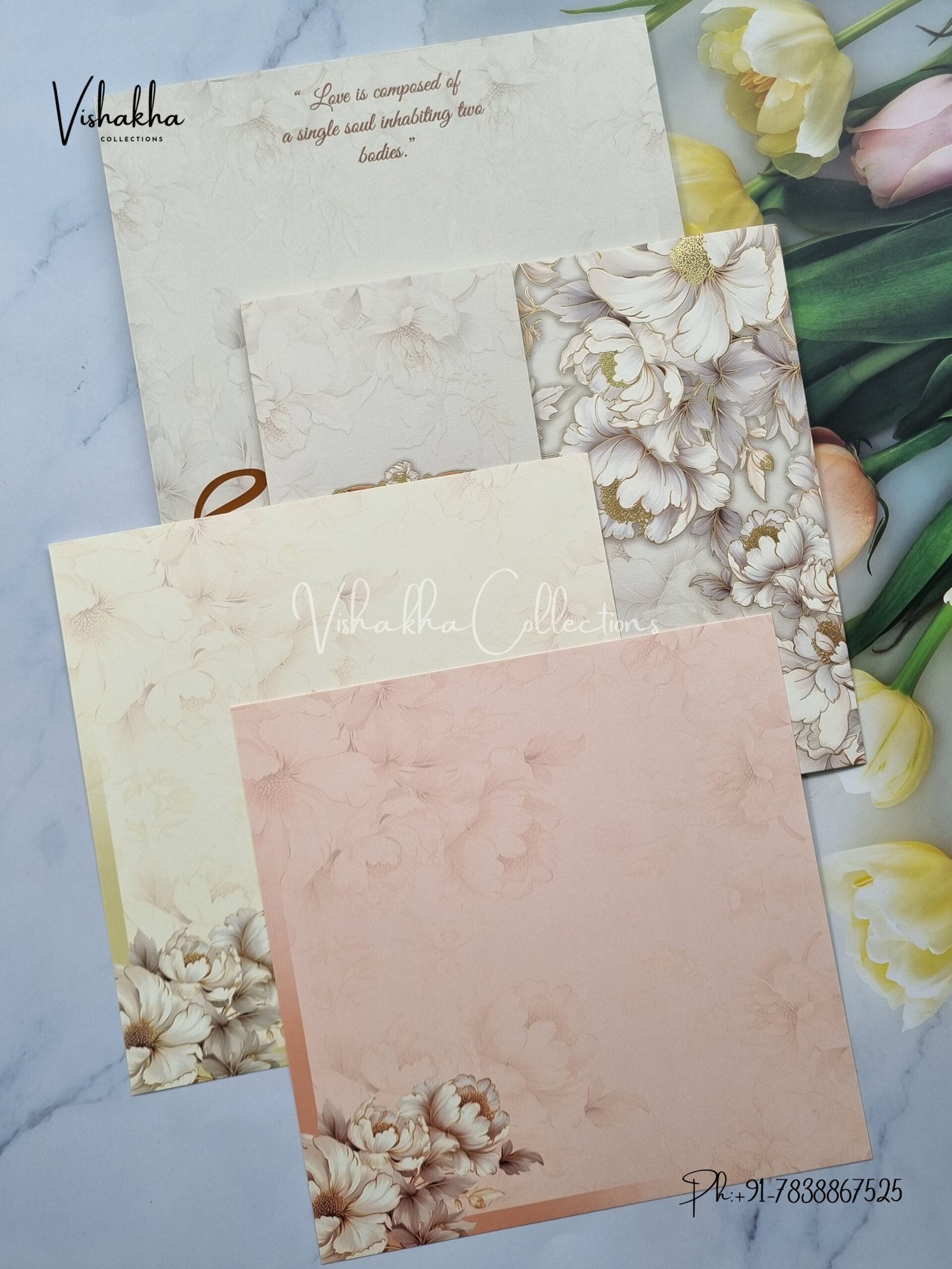 Vishakha Collections presents you beautiful luxury wedding invitation cards with all latest designs and the latest variety. Its just not a wedding invitation card but a beautiful feeling of love and relationship it carries for you. Beautifully printed and packed with a bundle of love. if you like it, dont think again, just go for it.If you are worrying about the quality of the product, send your doubts to us. We are here to help you. If you want in wholesale or bulk, dont forget to contact us.
