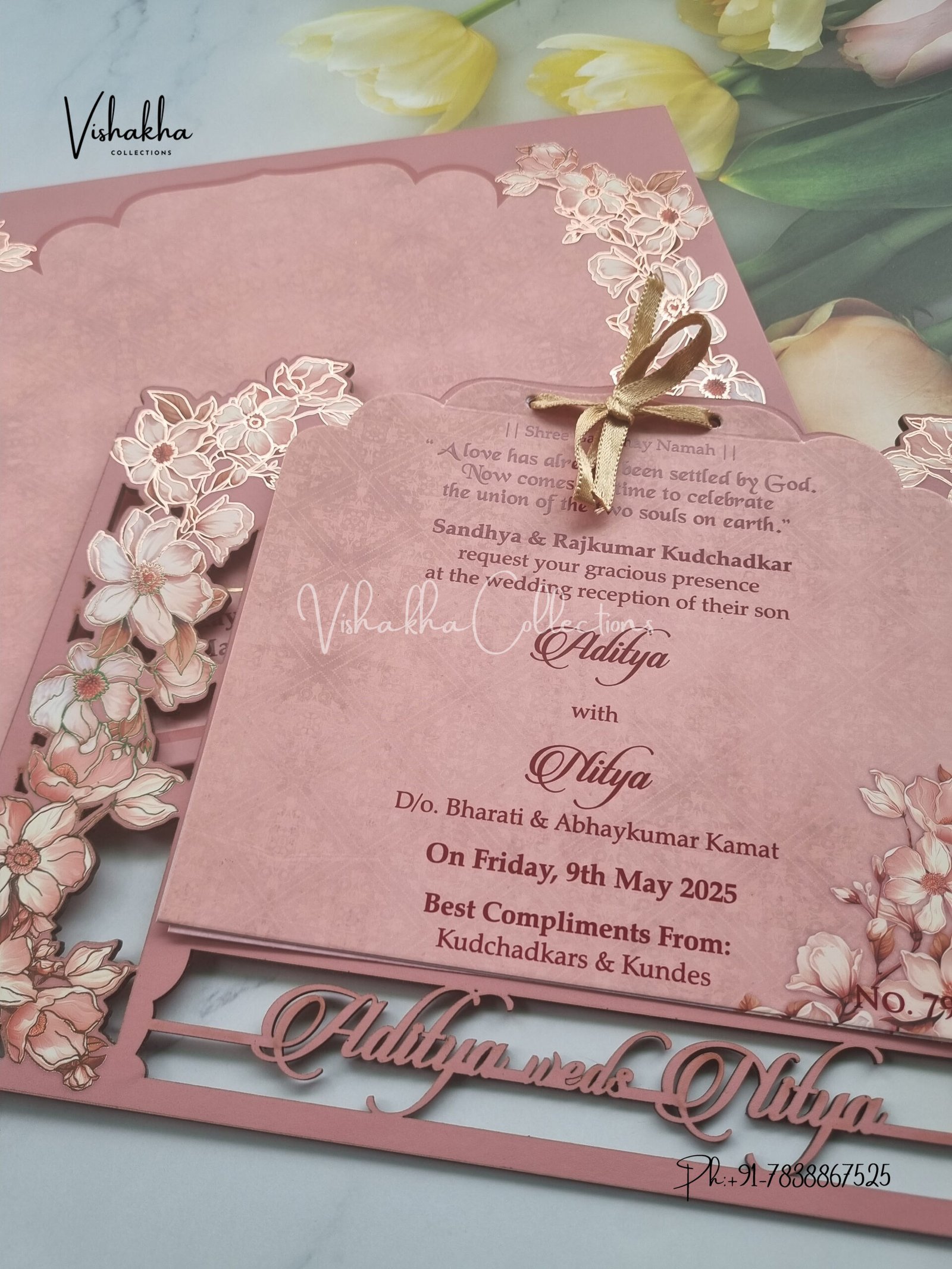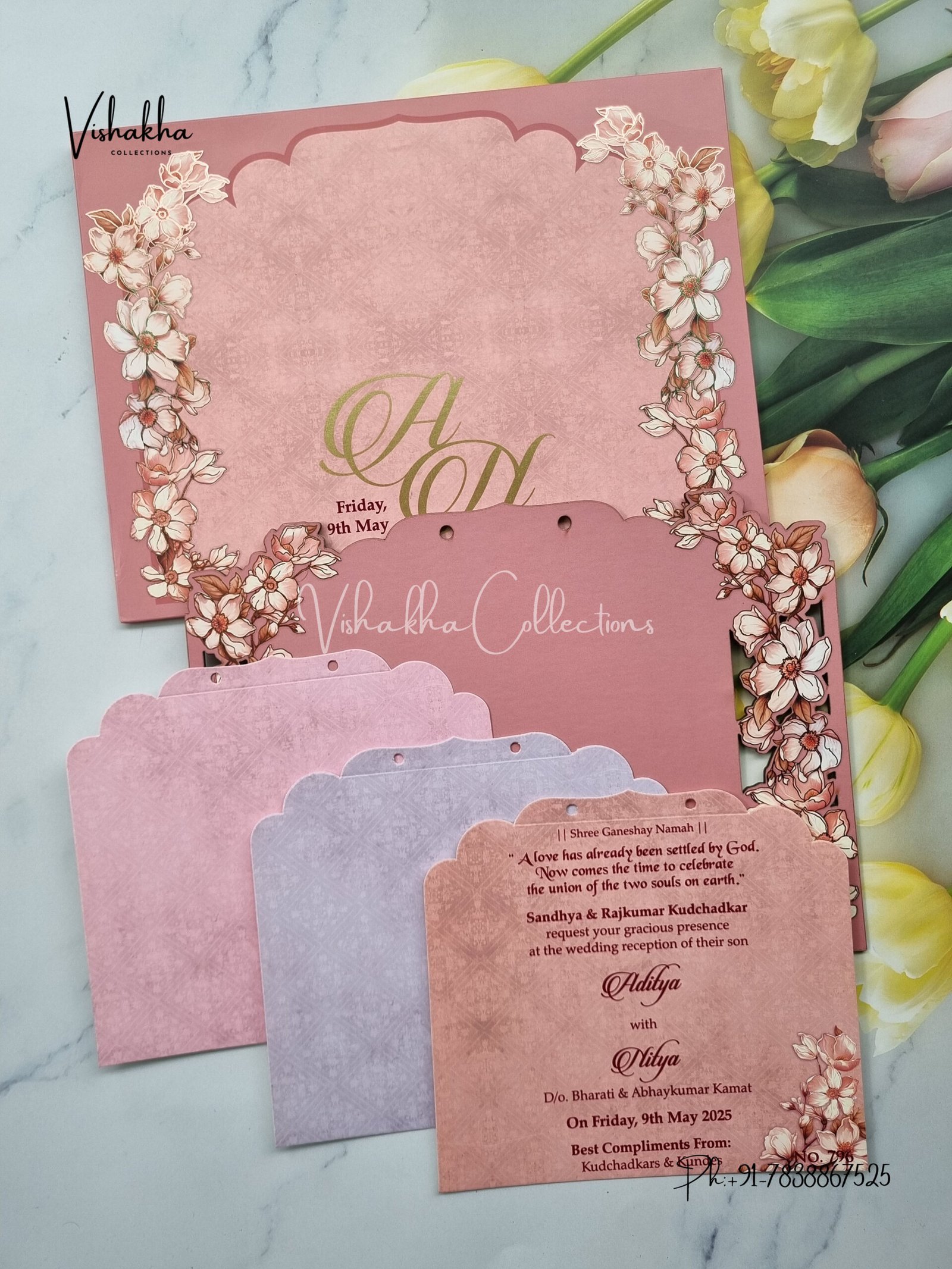 Vishakha Collections presents you beautiful luxury wedding invitation cards with all latest designs and the latest variety. Its just not a wedding invitation card but a beautiful feeling of love and relationship it carries for you. Beautifully printed and packed with a bundle of love. if you like it, dont think again, just go for it.If you are worrying about the quality of the product, send your doubts to us. We are here to help you. If you want in wholesale or bulk, dont forget to contact us.