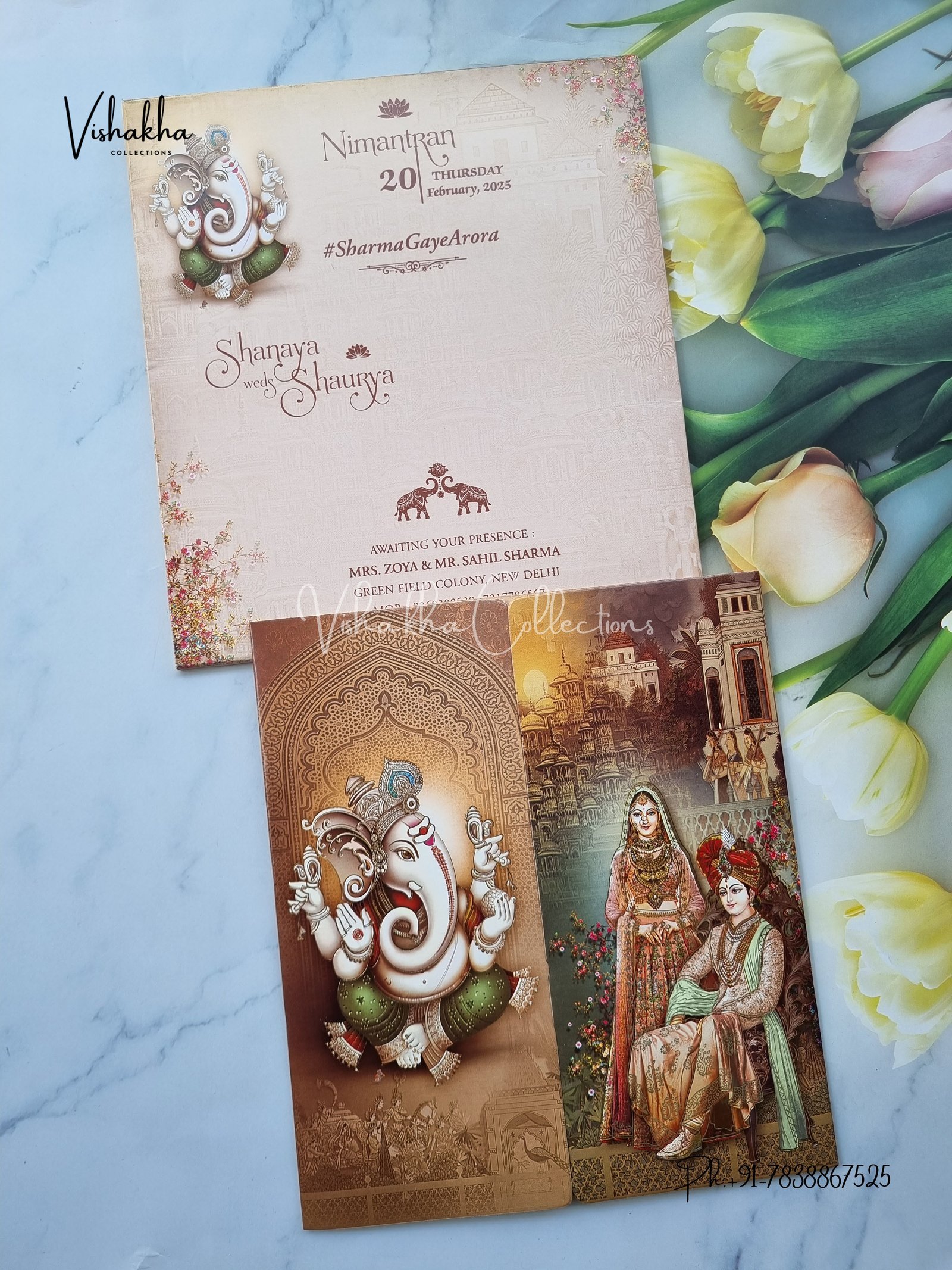 Vishakha Collections presents you beautiful luxury wedding invitation cards with all latest designs and the latest variety. Its just not a wedding invitation card but a beautiful feeling of love and relationship it carries for you. Beautifully printed and packed with a bundle of love. if you like it, dont think again, just go for it.If you are worrying about the quality of the product, send your doubts to us. We are here to help you. If you want in wholesale or bulk, dont forget to contact us.