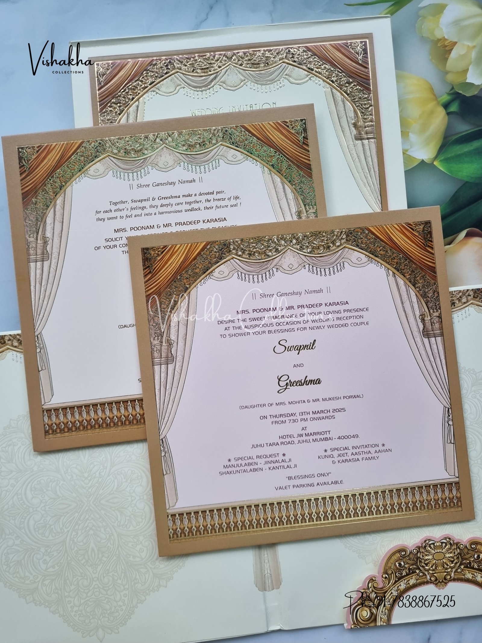 Vishakha Collections presents you beautiful luxury wedding invitation cards with all latest designs and the latest variety. Its just not a wedding invitation card but a beautiful feeling of love and relationship it carries for you. Beautifully printed and packed with a bundle of love. if you like it, dont think again, just go for it.If you are worrying about the quality of the product, send your doubts to us. We are here to help you. If you want in wholesale or bulk, dont forget to contact us.