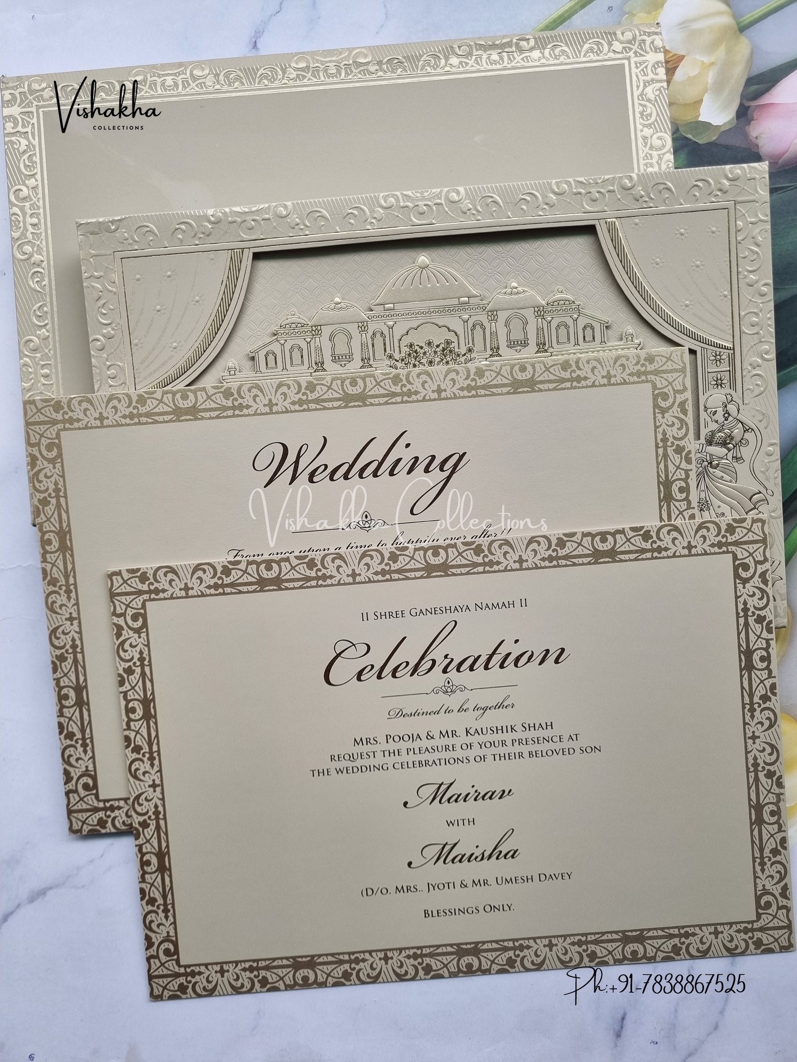 Vishakha Collections presents you beautiful luxury wedding invitation cards with all latest designs and the latest variety. Its just not a wedding invitation card but a beautiful feeling of love and relationship it carries for you. Beautifully printed and packed with a bundle of love. if you like it, dont think again, just go for it.If you are worrying about the quality of the product, send your doubts to us. We are here to help you. If you want in wholesale or bulk, dont forget to contact us.