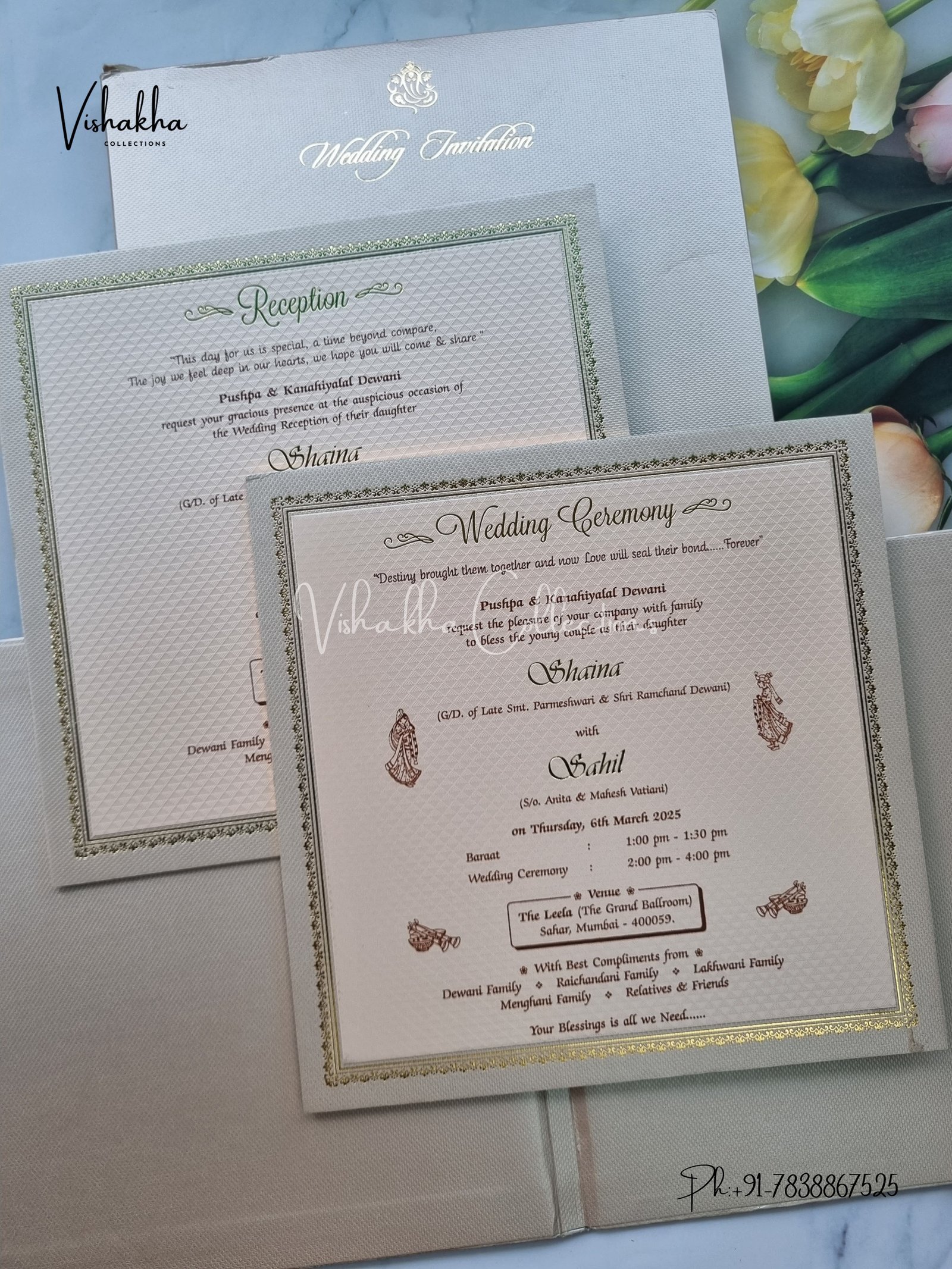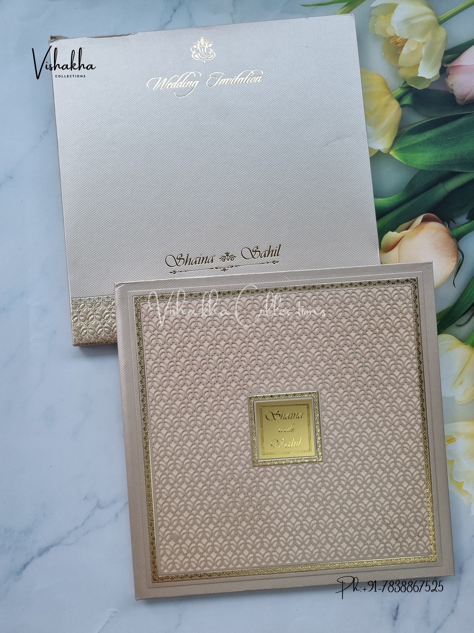 Vishakha Collections presents you beautiful luxury wedding invitation cards with all latest designs and the latest variety. Its just not a wedding invitation card but a beautiful feeling of love and relationship it carries for you. Beautifully printed and packed with a bundle of love. if you like it, dont think again, just go for it.If you are worrying about the quality of the product, send your doubts to us. We are here to help you. If you want in wholesale or bulk, dont forget to contact us.