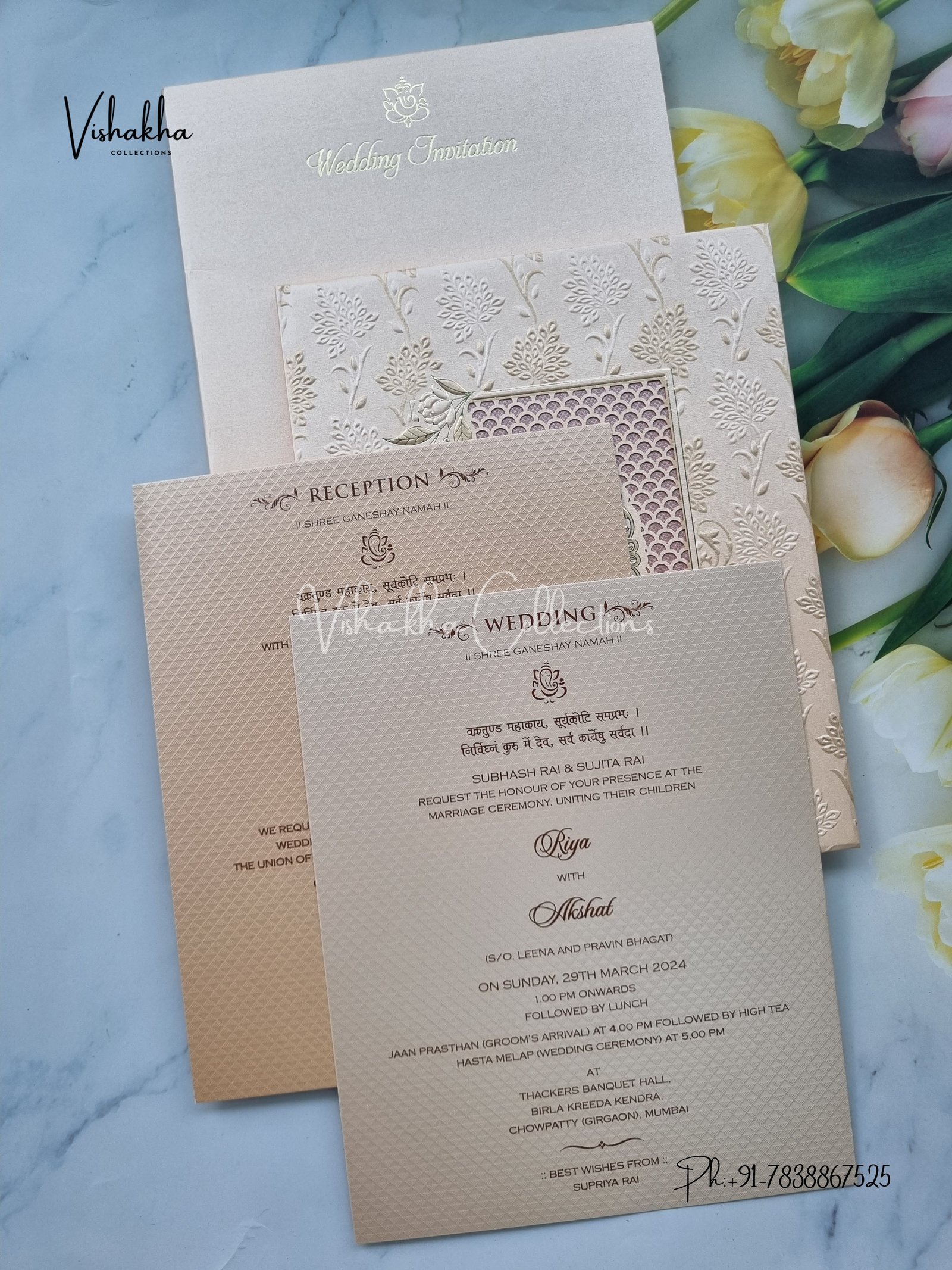 Vishakha Collections presents you beautiful luxury wedding invitation cards with all latest designs and the latest variety. Its just not a wedding invitation card but a beautiful feeling of love and relationship it carries for you. Beautifully printed and packed with a bundle of love. if you like it, dont think again, just go for it.If you are worrying about the quality of the product, send your doubts to us. We are here to help you. If you want in wholesale or bulk, dont forget to contact us.