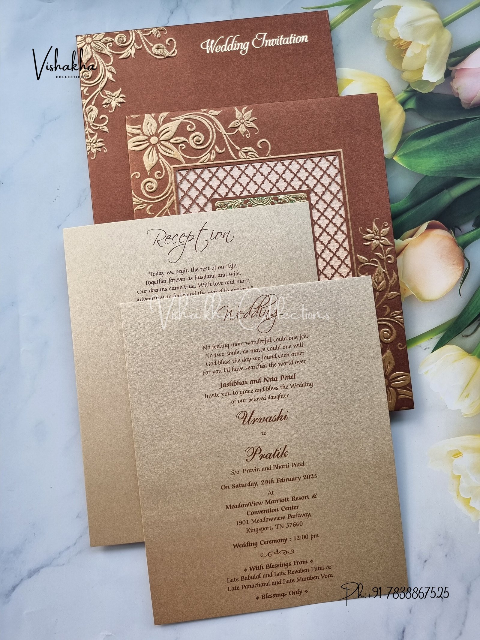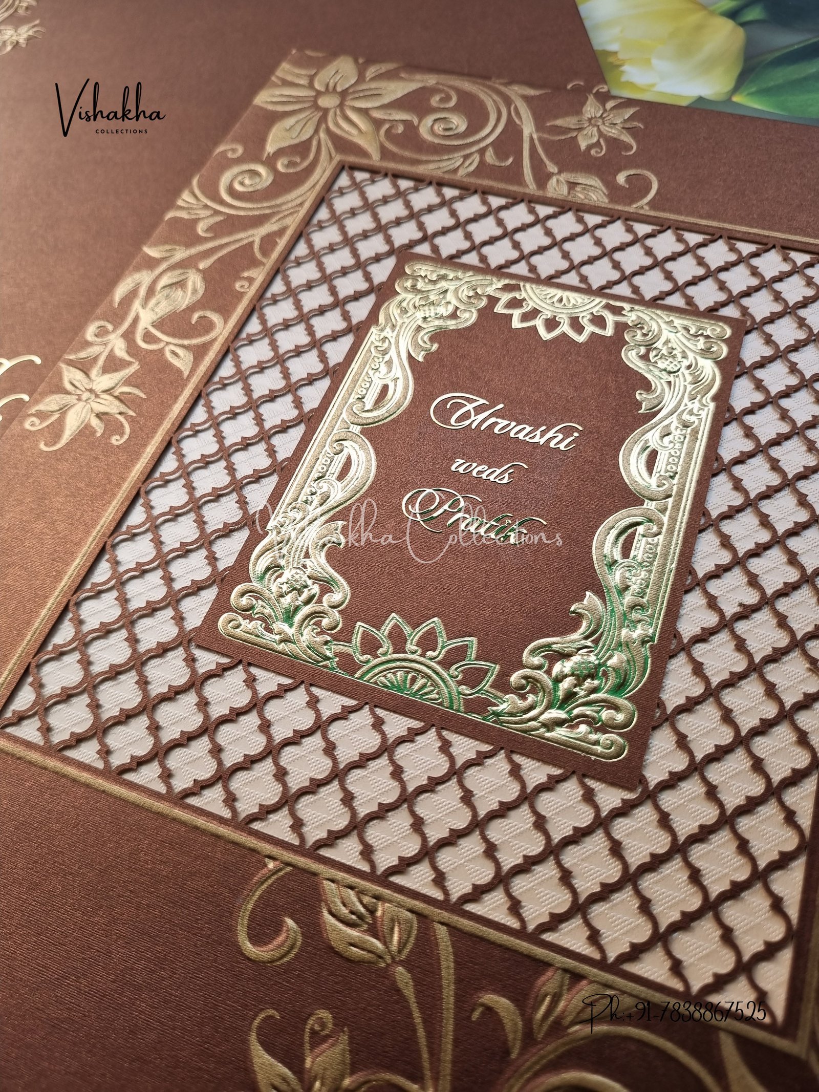 Vishakha Collections presents you beautiful luxury wedding invitation cards with all latest designs and the latest variety. Its just not a wedding invitation card but a beautiful feeling of love and relationship it carries for you. Beautifully printed and packed with a bundle of love. if you like it, dont think again, just go for it.If you are worrying about the quality of the product, send your doubts to us. We are here to help you. If you want in wholesale or bulk, dont forget to contact us.