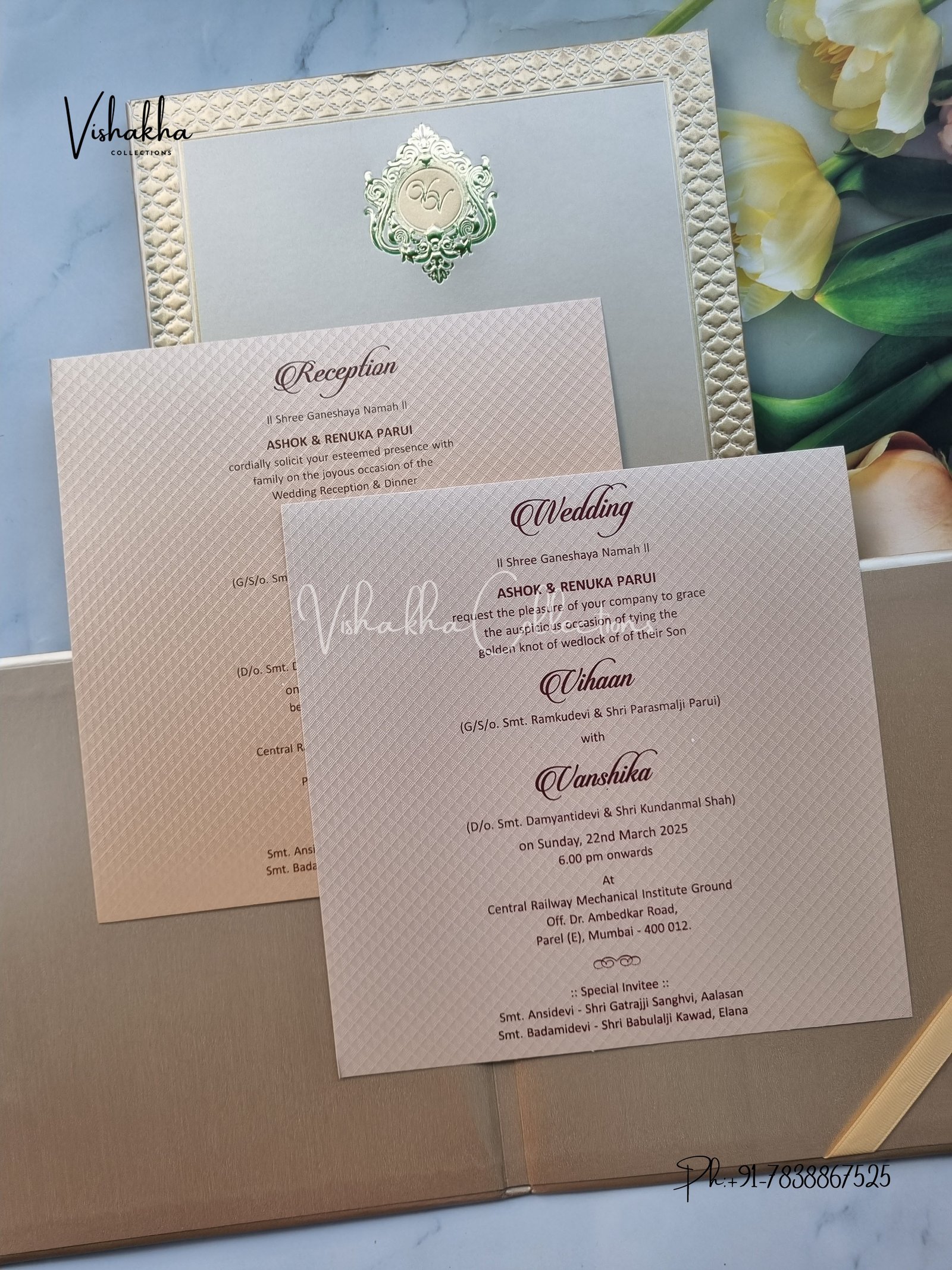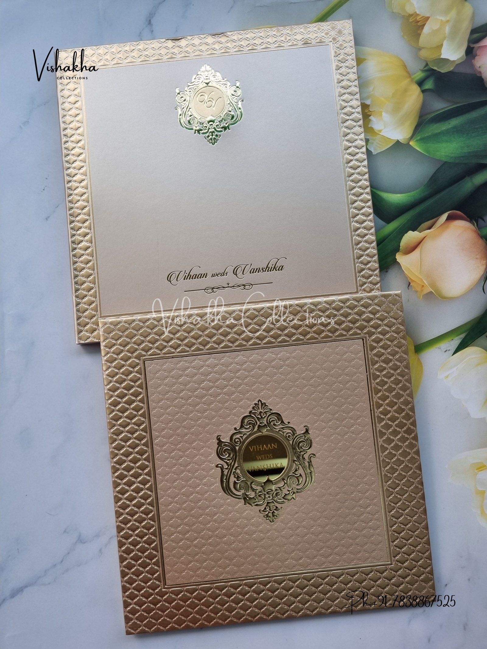 Vishakha Collections presents you beautiful luxury wedding invitation cards with all latest designs and the latest variety. Its just not a wedding invitation card but a beautiful feeling of love and relationship it carries for you. Beautifully printed and packed with a bundle of love. if you like it, dont think again, just go for it.If you are worrying about the quality of the product, send your doubts to us. We are here to help you. If you want in wholesale or bulk, dont forget to contact us.