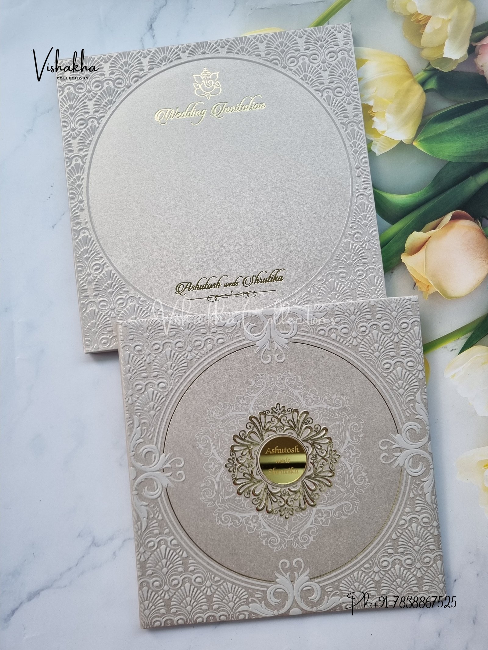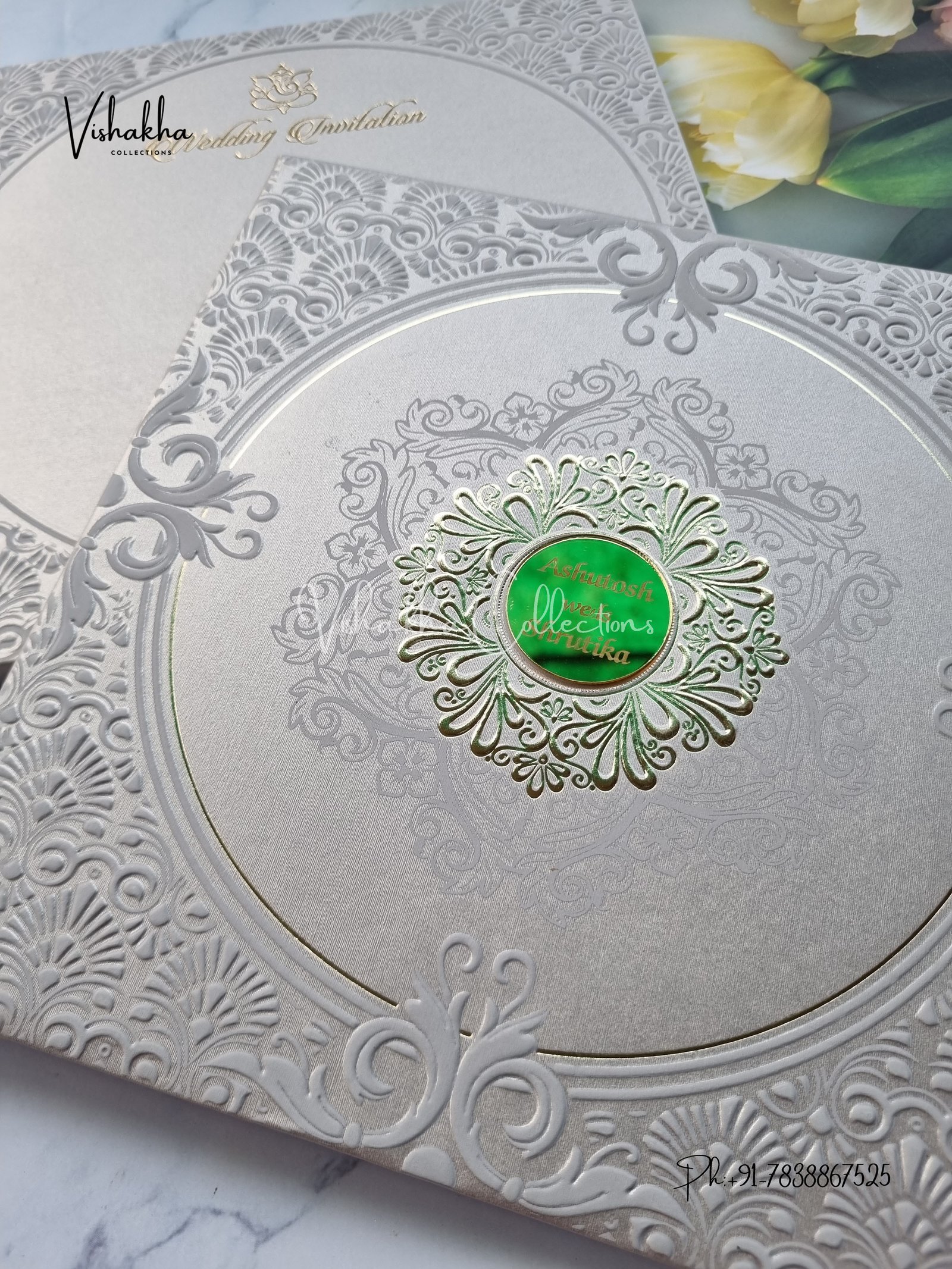 Vishakha Collections presents you beautiful luxury wedding invitation cards with all latest designs and the latest variety. Its just not a wedding invitation card but a beautiful feeling of love and relationship it carries for you. Beautifully printed and packed with a bundle of love. if you like it, dont think again, just go for it.If you are worrying about the quality of the product, send your doubts to us. We are here to help you. If you want in wholesale or bulk, dont forget to contact us.