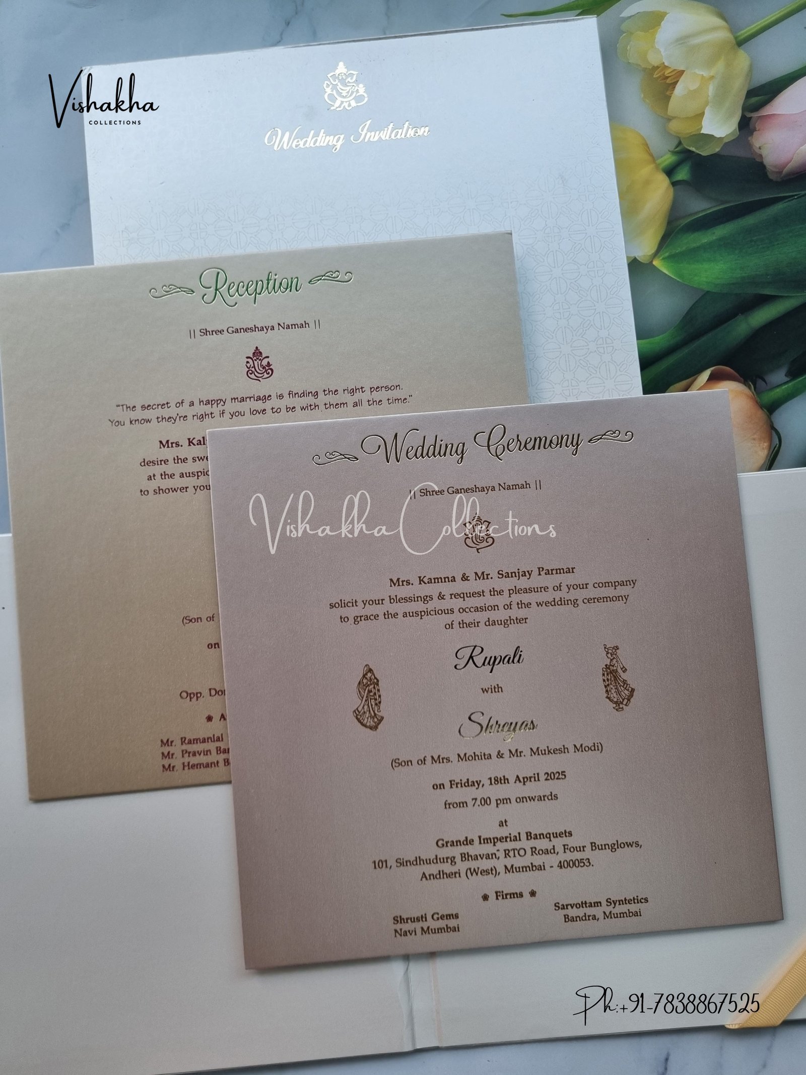 Vishakha Collections presents you beautiful luxury wedding invitation cards with all latest designs and the latest variety. Its just not a wedding invitation card but a beautiful feeling of love and relationship it carries for you. Beautifully printed and packed with a bundle of love. if you like it, dont think again, just go for it.If you are worrying about the quality of the product, send your doubts to us. We are here to help you. If you want in wholesale or bulk, dont forget to contact us.