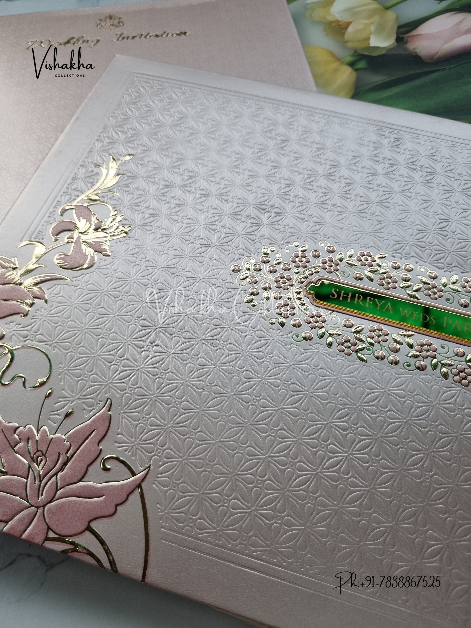Vishakha Collections presents you beautiful luxury wedding invitation cards with all latest designs and the latest variety. Its just not a wedding invitation card but a beautiful feeling of love and relationship it carries for you. Beautifully printed and packed with a bundle of love. if you like it, dont think again, just go for it.If you are worrying about the quality of the product, send your doubts to us. We are here to help you. If you want in wholesale or bulk, dont forget to contact us.