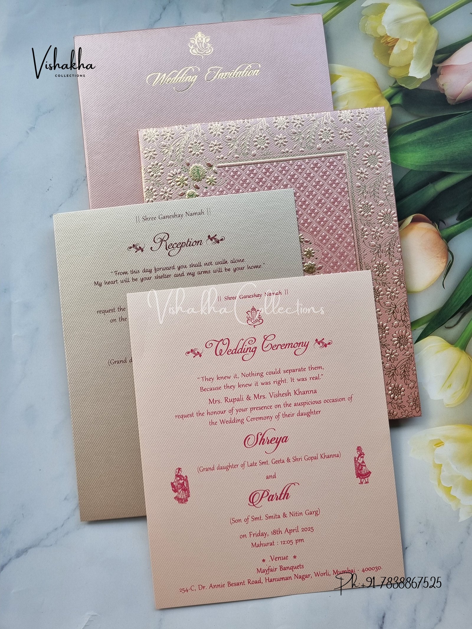 Vishakha Collections presents you beautiful luxury wedding invitation cards with all latest designs and the latest variety. Its just not a wedding invitation card but a beautiful feeling of love and relationship it carries for you. Beautifully printed and packed with a bundle of love. if you like it, dont think again, just go for it.If you are worrying about the quality of the product, send your doubts to us. We are here to help you. If you want in wholesale or bulk, dont forget to contact us.