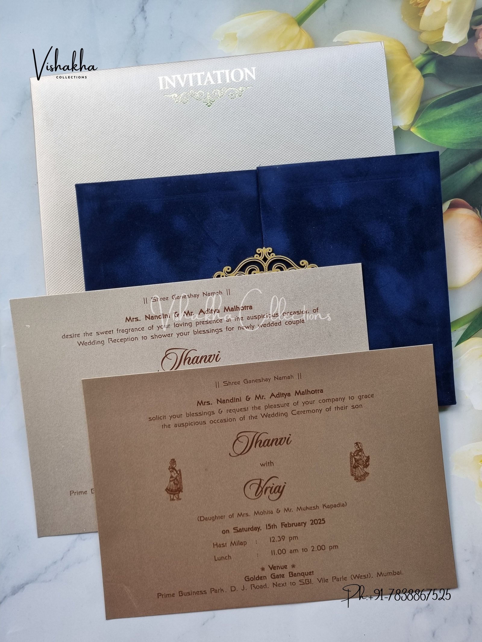 Vishakha Collections presents you beautiful luxury wedding invitation cards with all latest designs and the latest variety. Its just not a wedding invitation card but a beautiful feeling of love and relationship it carries for you. Beautifully printed and packed with a bundle of love. if you like it, dont think again, just go for it.If you are worrying about the quality of the product, send your doubts to us. We are here to help you. If you want in wholesale or bulk, dont forget to contact us.