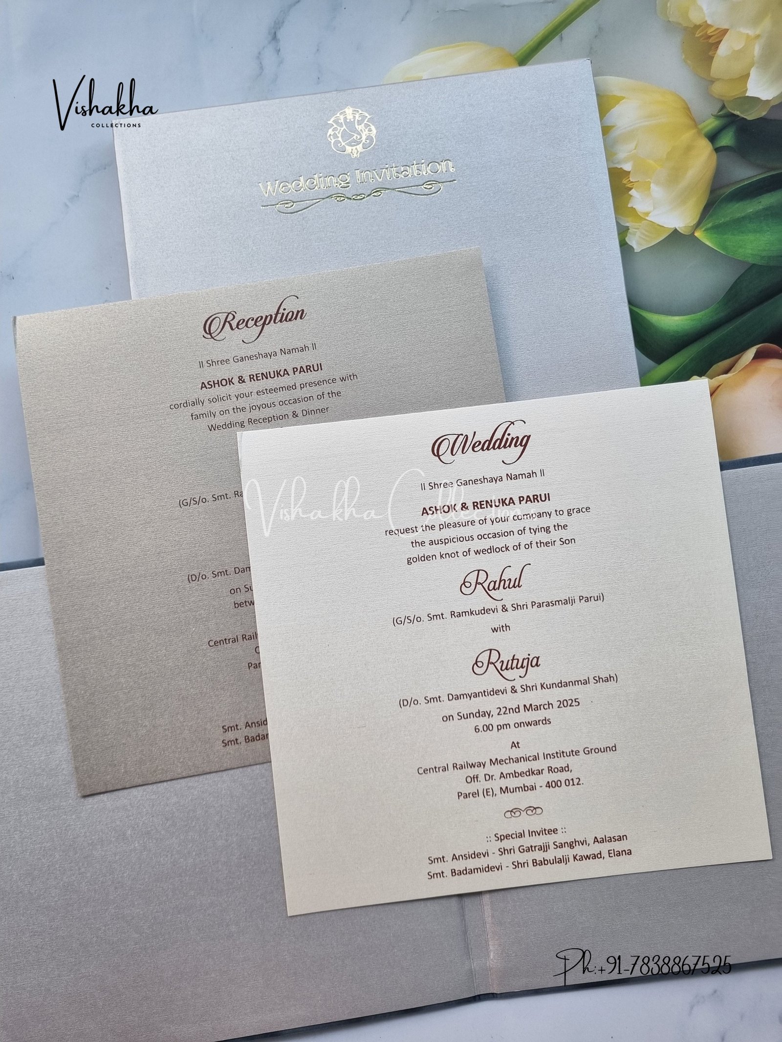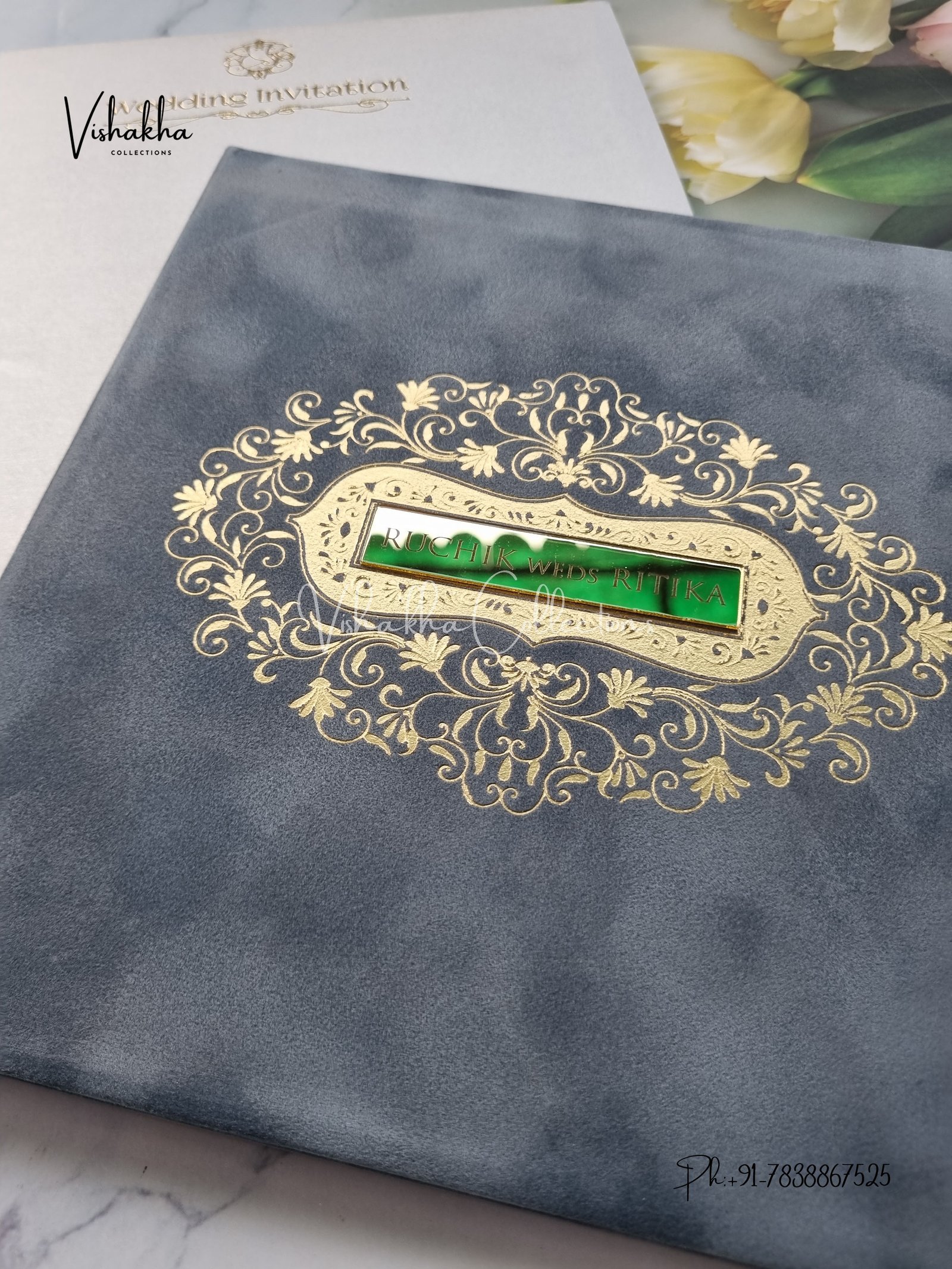 Vishakha Collections presents you beautiful luxury wedding invitation cards with all latest designs and the latest variety. Its just not a wedding invitation card but a beautiful feeling of love and relationship it carries for you. Beautifully printed and packed with a bundle of love. if you like it, dont think again, just go for it.If you are worrying about the quality of the product, send your doubts to us. We are here to help you. If you want in wholesale or bulk, dont forget to contact us.