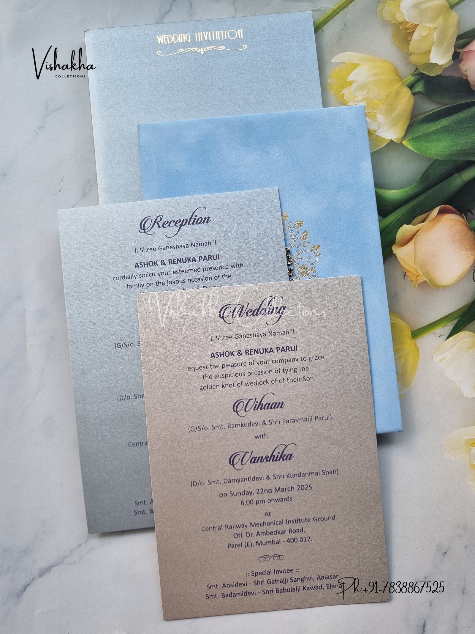 Vishakha Collections presents you beautiful luxury wedding invitation cards with all latest designs and the latest variety. Its just not a wedding invitation card but a beautiful feeling of love and relationship it carries for you. Beautifully printed and packed with a bundle of love. if you like it, dont think again, just go for it.If you are worrying about the quality of the product, send your doubts to us. We are here to help you. If you want in wholesale or bulk, dont forget to contact us.