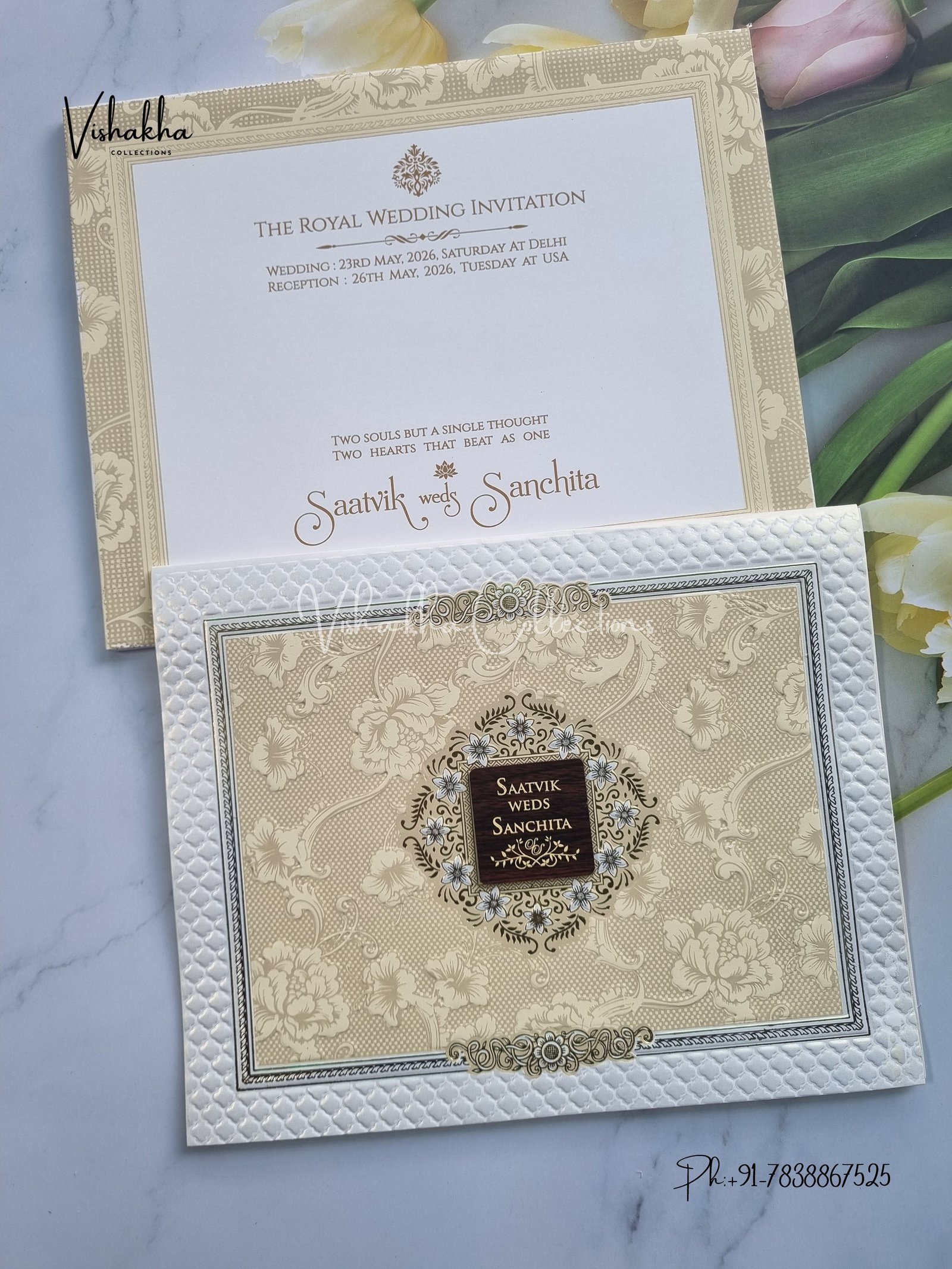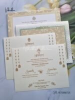 Vishakha Collections presents you beautiful luxury wedding invitation cards with all latest designs and the latest variety. Its just not a wedding invitation card but a beautiful feeling of love and relationship it carries for you. Beautifully printed and packed with a bundle of love. if you like it, dont think again, just go for it.If you are worrying about the quality of the product, send your doubts to us. We are here to help you. If you want in wholesale or bulk, dont forget to contact us.