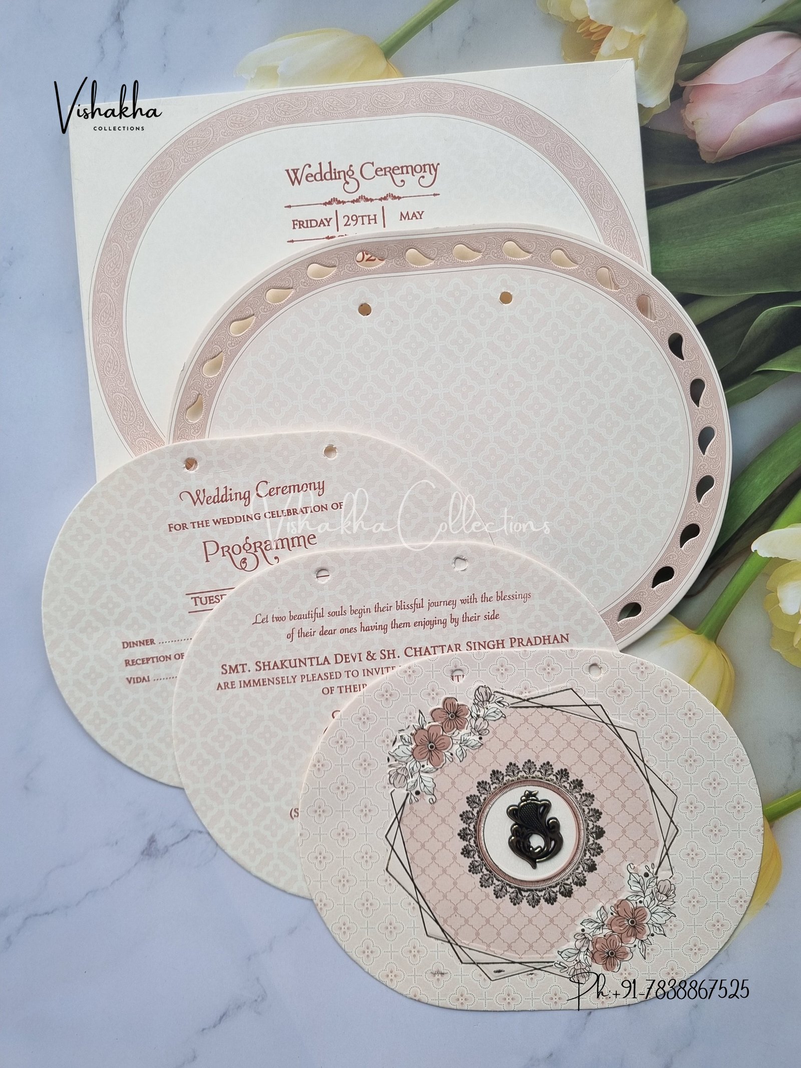 Vishakha Collections presents you beautiful luxury wedding invitation cards with all latest designs and the latest variety. Its just not a wedding invitation card but a beautiful feeling of love and relationship it carries for you. Beautifully printed and packed with a bundle of love. if you like it, dont think again, just go for it.If you are worrying about the quality of the product, send your doubts to us. We are here to help you. If you want in wholesale or bulk, dont forget to contact us.