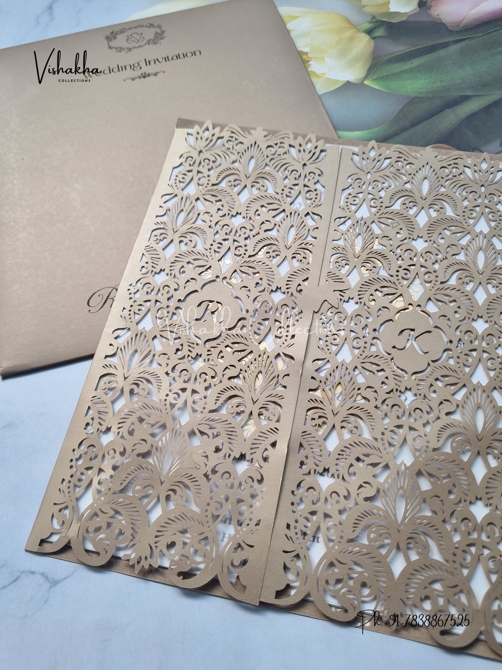 Vishakha Collections presents you beautiful luxury wedding invitation cards with all latest designs and the latest variety. Its just not a wedding invitation card but a beautiful feeling of love and relationship it carries for you. Beautifully printed and packed with a bundle of love. if you like it, dont think again, just go for it.If you are worrying about the quality of the product, send your doubts to us. We are here to help you. If you want in wholesale or bulk, dont forget to contact us.