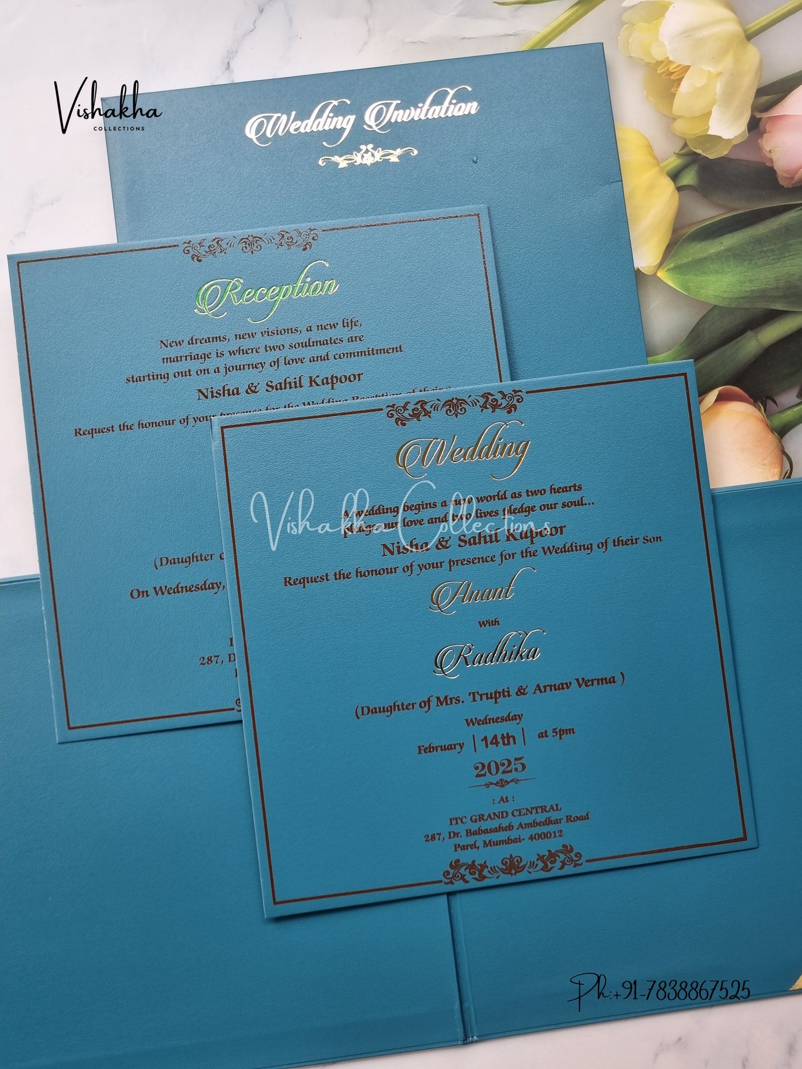 Vishakha Collections presents you beautiful luxury wedding invitation cards with all latest designs and the latest variety. Its just not a wedding invitation card but a beautiful feeling of love and relationship it carries for you. Beautifully printed and packed with a bundle of love. if you like it, dont think again, just go for it.If you are worrying about the quality of the product, send your doubts to us. We are here to help you. If you want in wholesale or bulk, dont forget to contact us.