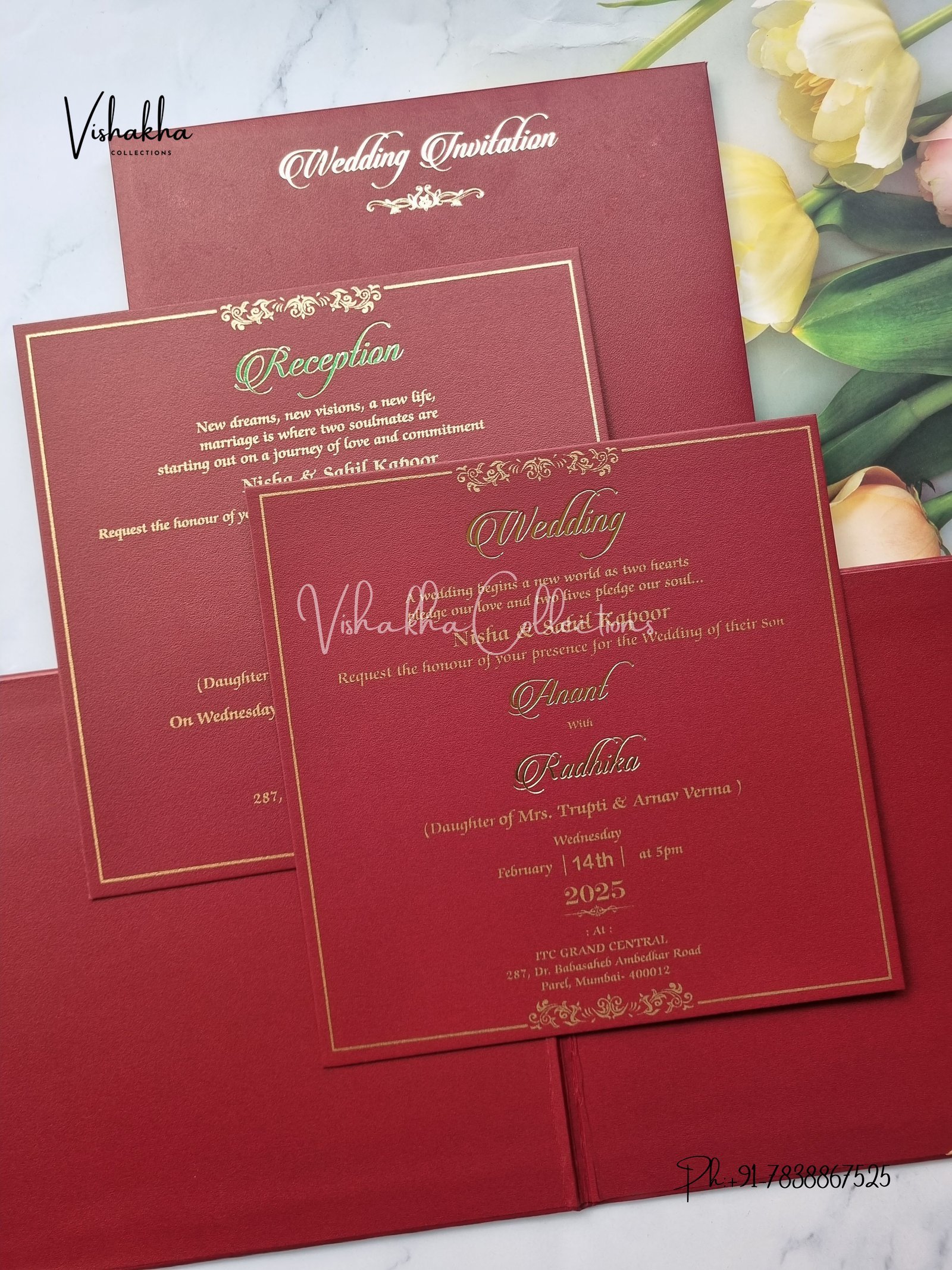 Vishakha Collections presents you beautiful luxury wedding invitation cards with all latest designs and the latest variety. Its just not a wedding invitation card but a beautiful feeling of love and relationship it carries for you. Beautifully printed and packed with a bundle of love. if you like it, dont think again, just go for it.If you are worrying about the quality of the product, send your doubts to us. We are here to help you. If you want in wholesale or bulk, dont forget to contact us.