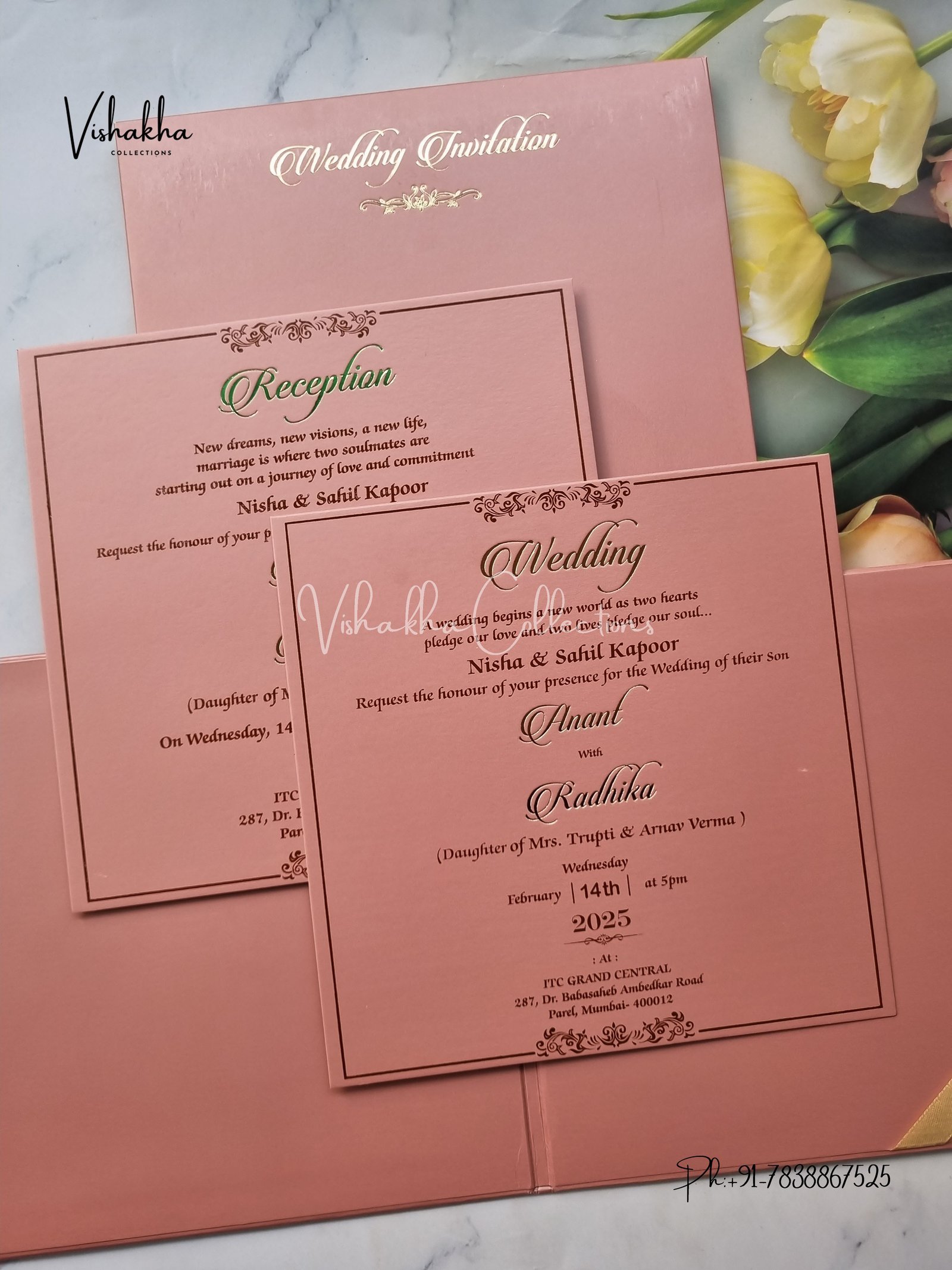 Vishakha Collections presents you beautiful luxury wedding invitation cards with all latest designs and the latest variety. Its just not a wedding invitation card but a beautiful feeling of love and relationship it carries for you. Beautifully printed and packed with a bundle of love. if you like it, dont think again, just go for it.If you are worrying about the quality of the product, send your doubts to us. We are here to help you. If you want in wholesale or bulk, dont forget to contact us.
