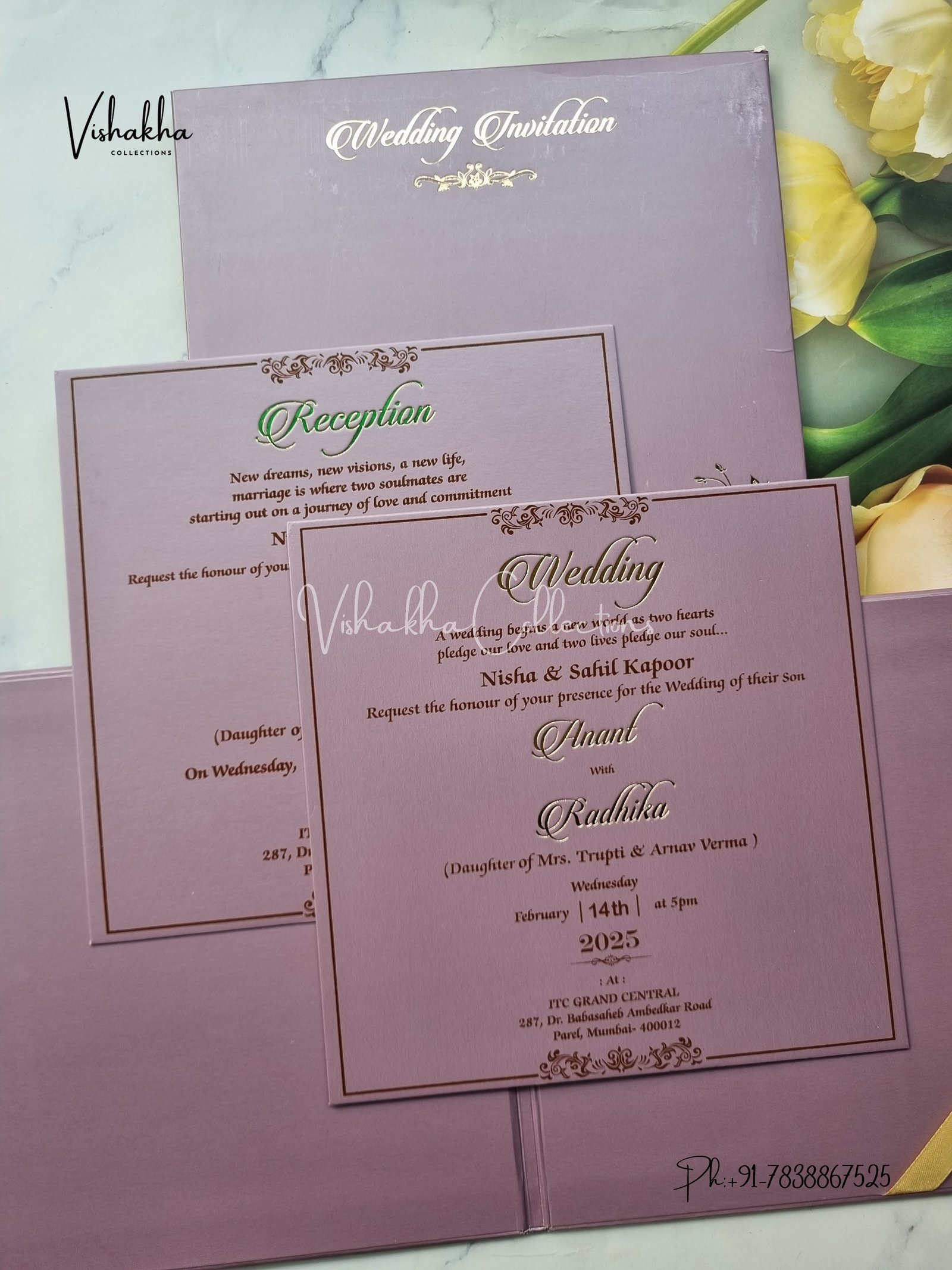 Vishakha Collections presents you beautiful luxury wedding invitation cards with all latest designs and the latest variety. Its just not a wedding invitation card but a beautiful feeling of love and relationship it carries for you. Beautifully printed and packed with a bundle of love. if you like it, dont think again, just go for it.If you are worrying about the quality of the product, send your doubts to us. We are here to help you. If you want in wholesale or bulk, dont forget to contact us.