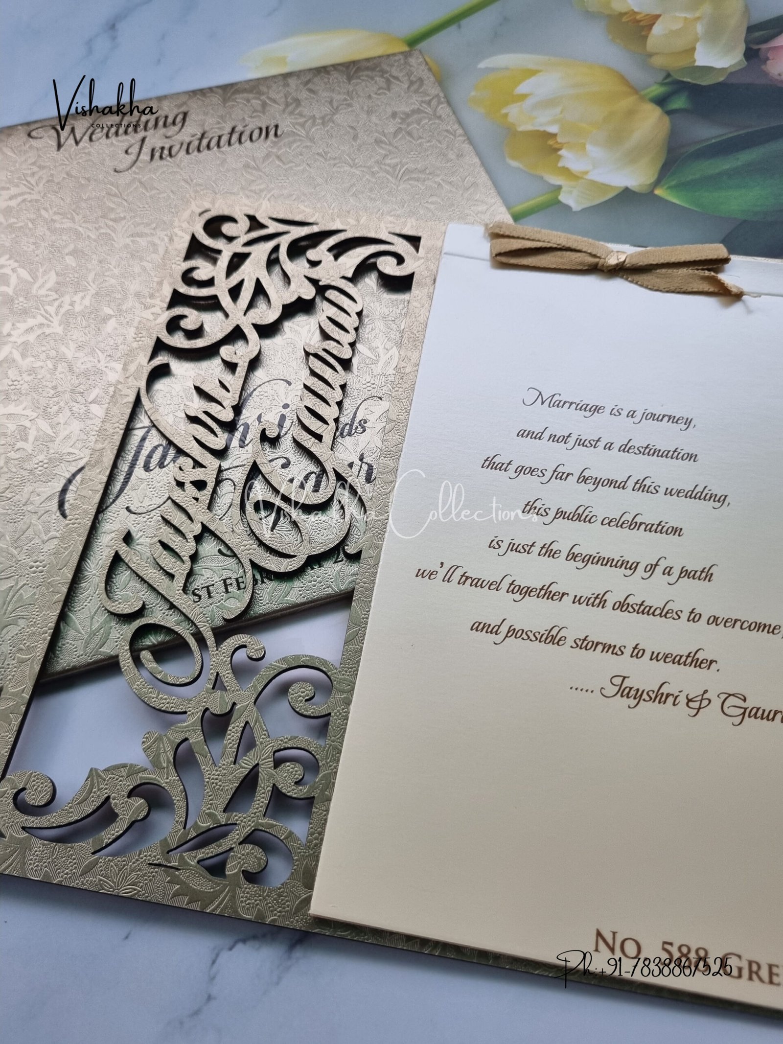 Vishakha Collections presents you beautiful luxury wedding invitation cards with all latest designs and the latest variety. Its just not a wedding invitation card but a beautiful feeling of love and relationship it carries for you. Beautifully printed and packed with a bundle of love. if you like it, dont think again, just go for it.If you are worrying about the quality of the product, send your doubts to us. We are here to help you. If you want in wholesale or bulk, dont forget to contact us.