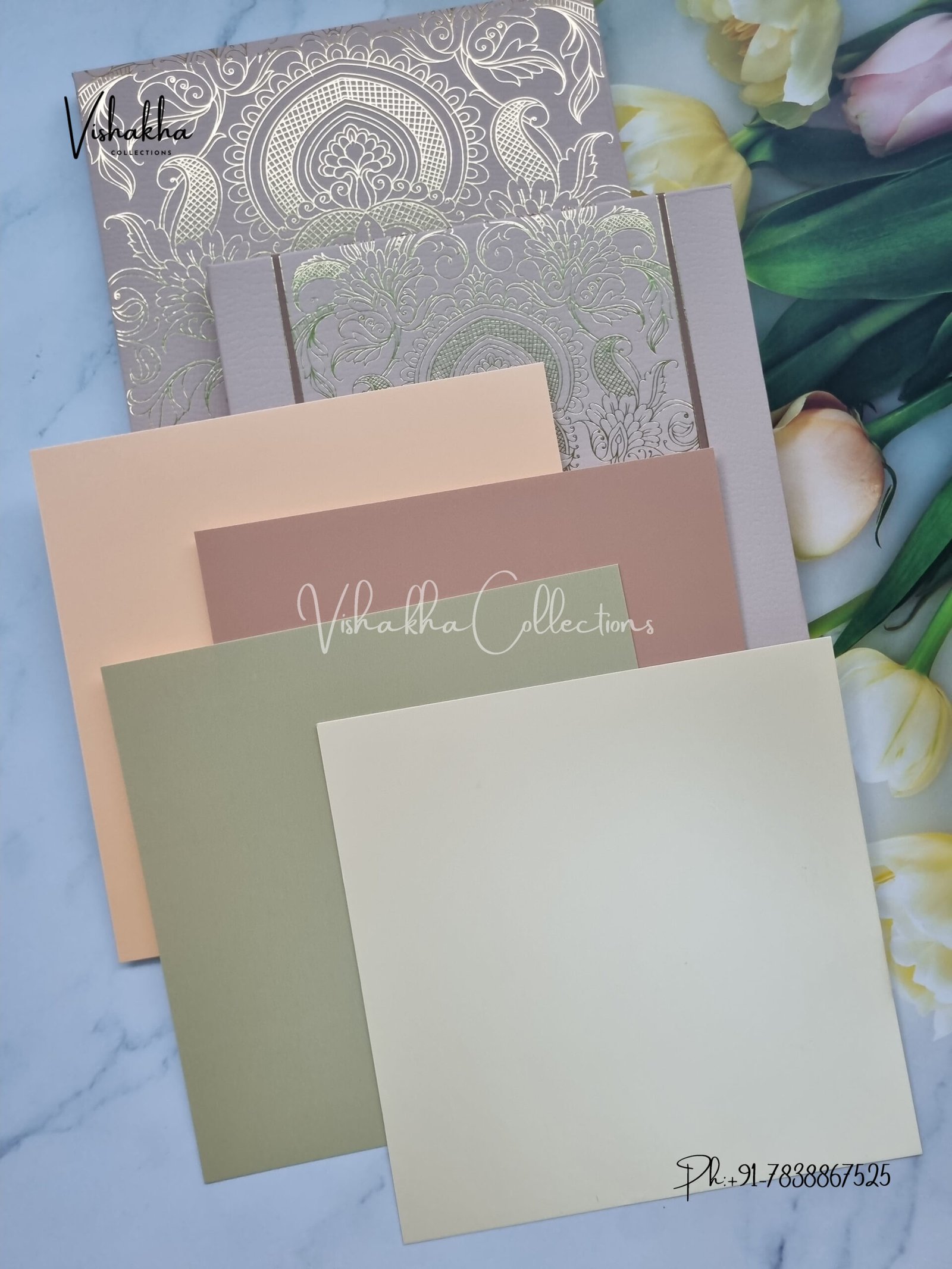 Vishakha Collections presents you beautiful luxury wedding invitation cards with all latest designs and the latest variety. Its just not a wedding invitation card but a beautiful feeling of love and relationship it carries for you. Beautifully printed and packed with a bundle of love. if you like it, dont think again, just go for it.If you are worrying about the quality of the product, send your doubts to us. We are here to help you. If you want in wholesale or bulk, dont forget to contact us.