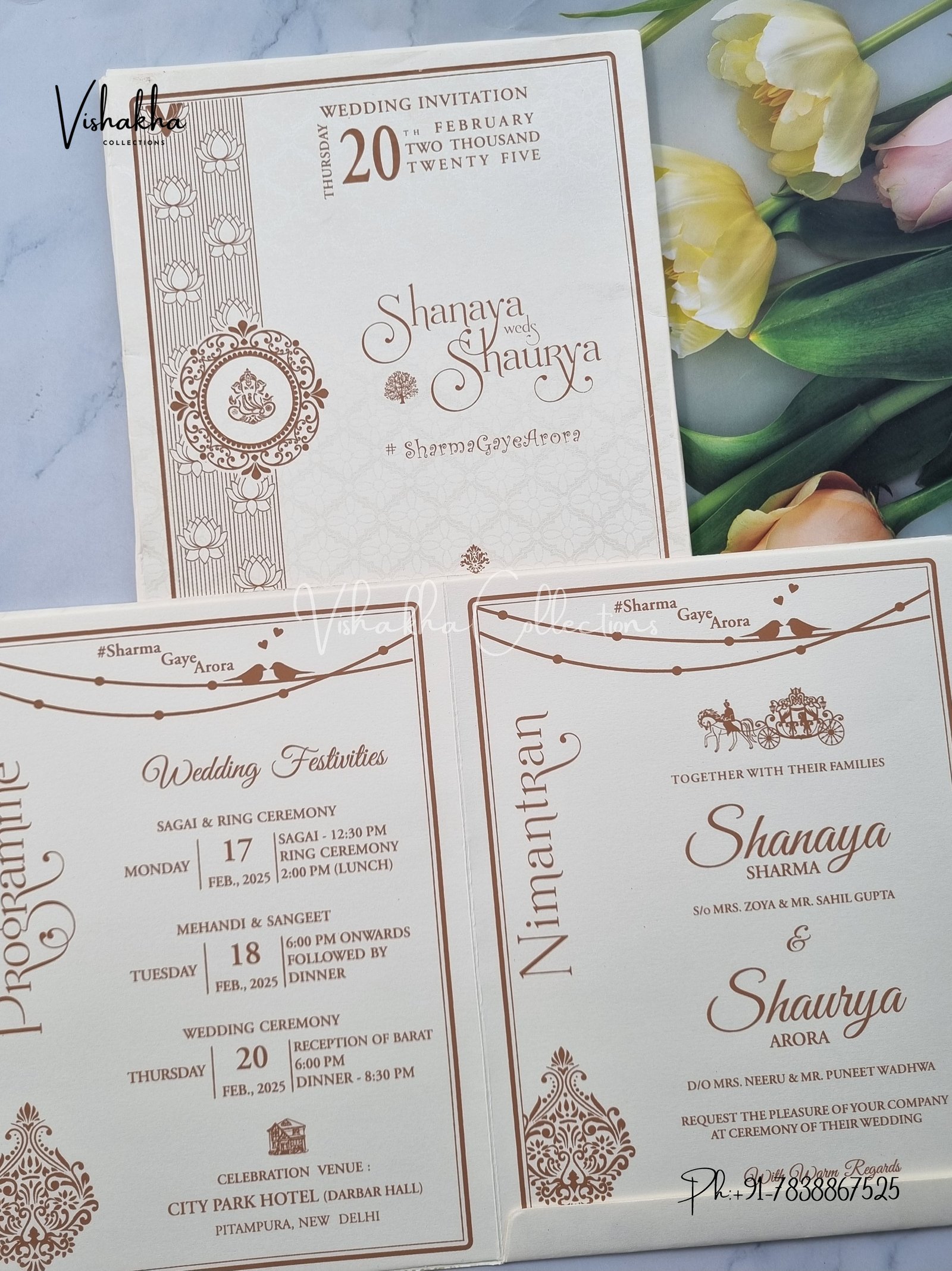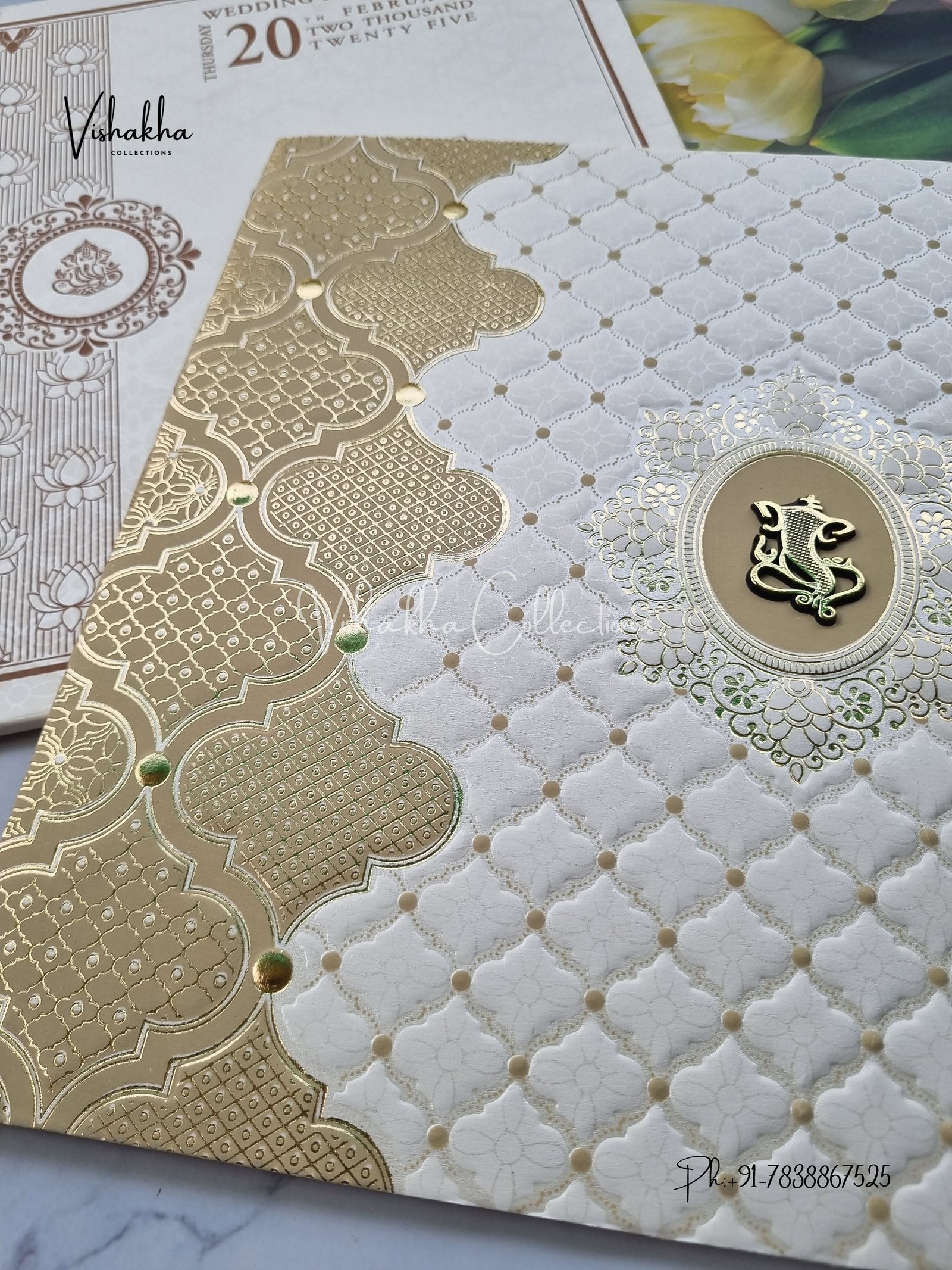 Vishakha Collections presents you beautiful luxury wedding invitation cards with all latest designs and the latest variety. Its just not a wedding invitation card but a beautiful feeling of love and relationship it carries for you. Beautifully printed and packed with a bundle of love. if you like it, dont think again, just go for it.If you are worrying about the quality of the product, send your doubts to us. We are here to help you. If you want in wholesale or bulk, dont forget to contact us.