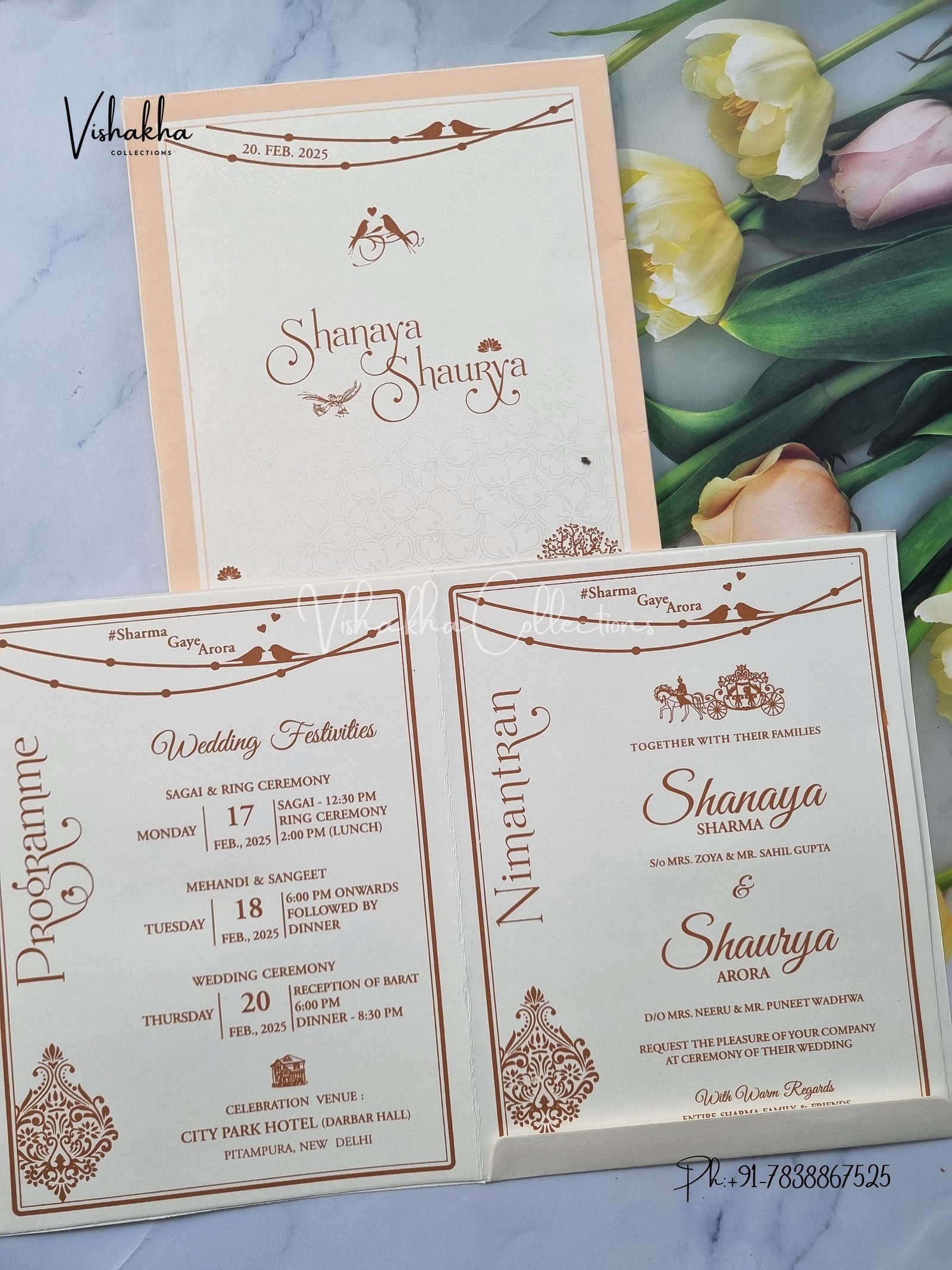 Vishakha Collections presents you beautiful luxury wedding invitation cards with all latest designs and the latest variety. Its just not a wedding invitation card but a beautiful feeling of love and relationship it carries for you. Beautifully printed and packed with a bundle of love. if you like it, dont think again, just go for it.If you are worrying about the quality of the product, send your doubts to us. We are here to help you. If you want in wholesale or bulk, dont forget to contact us.