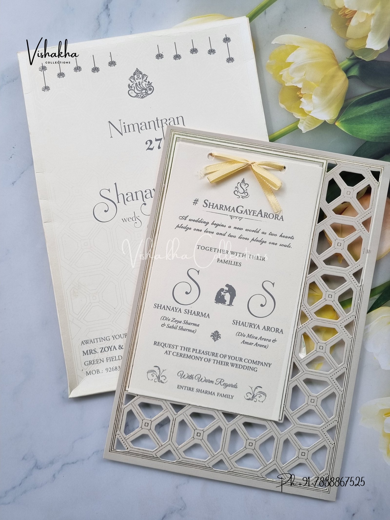 Semi Box Ganesh Ji White And golden Hindu invitation Cards ATS-1641