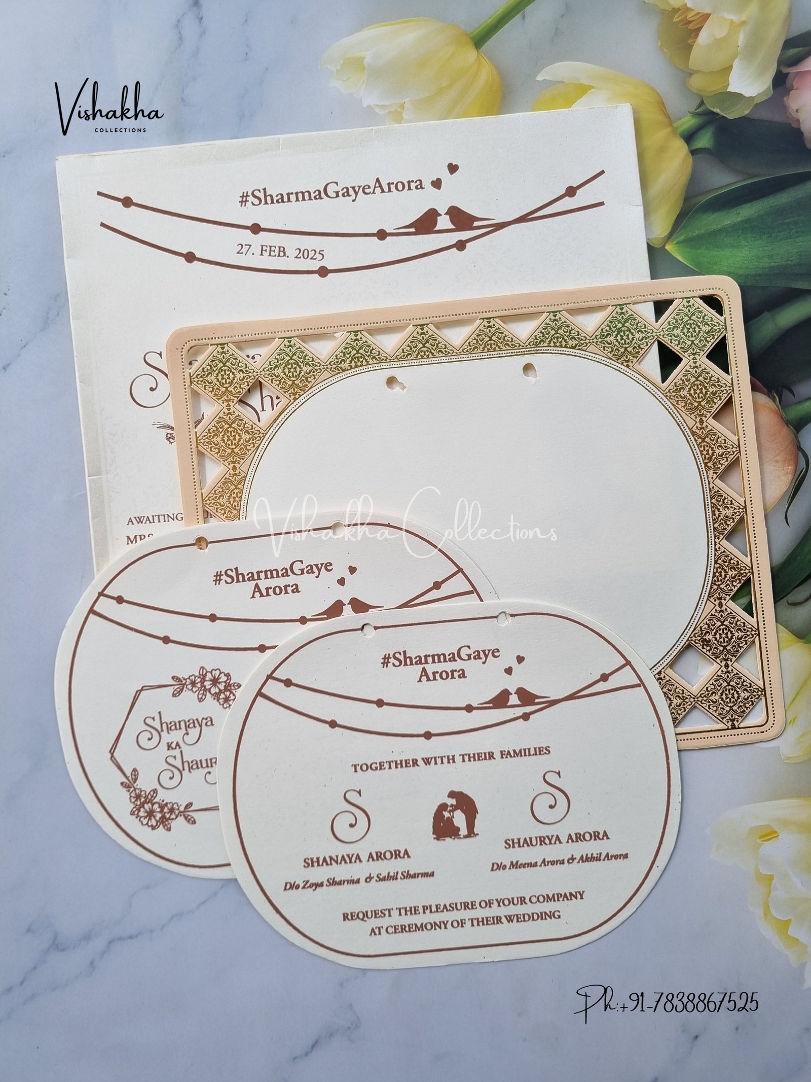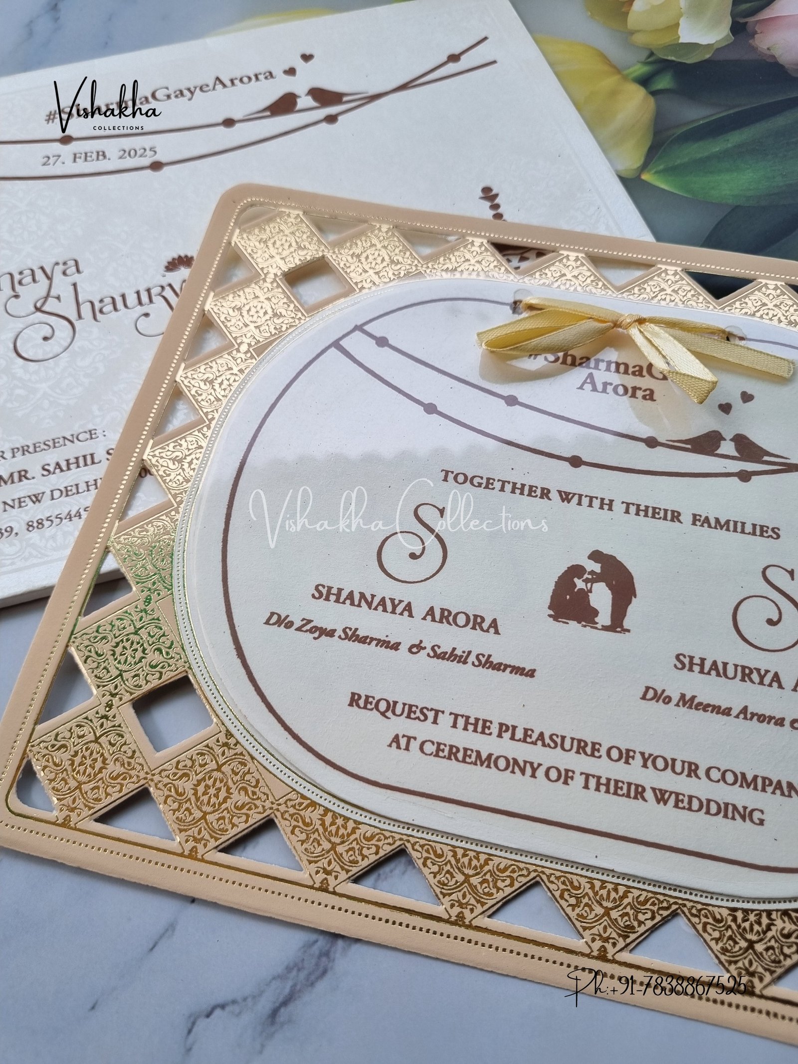 Vishakha Collections presents you beautiful luxury wedding invitation cards with all latest designs and the latest variety. Its just not a wedding invitation card but a beautiful feeling of love and relationship it carries for you. Beautifully printed and packed with a bundle of love. if you like it, dont think again, just go for it.If you are worrying about the quality of the product, send your doubts to us. We are here to help you. If you want in wholesale or bulk, dont forget to contact us.