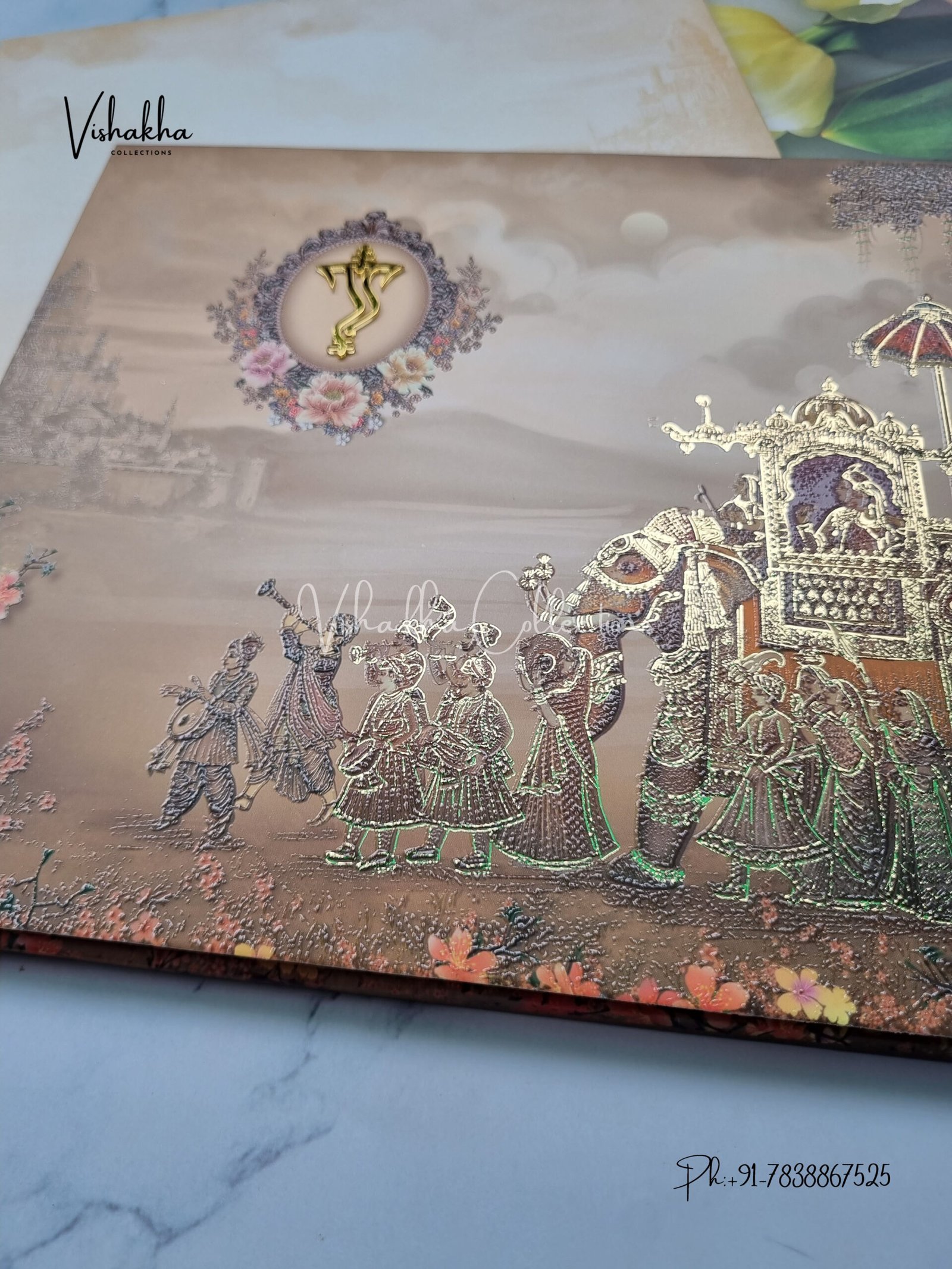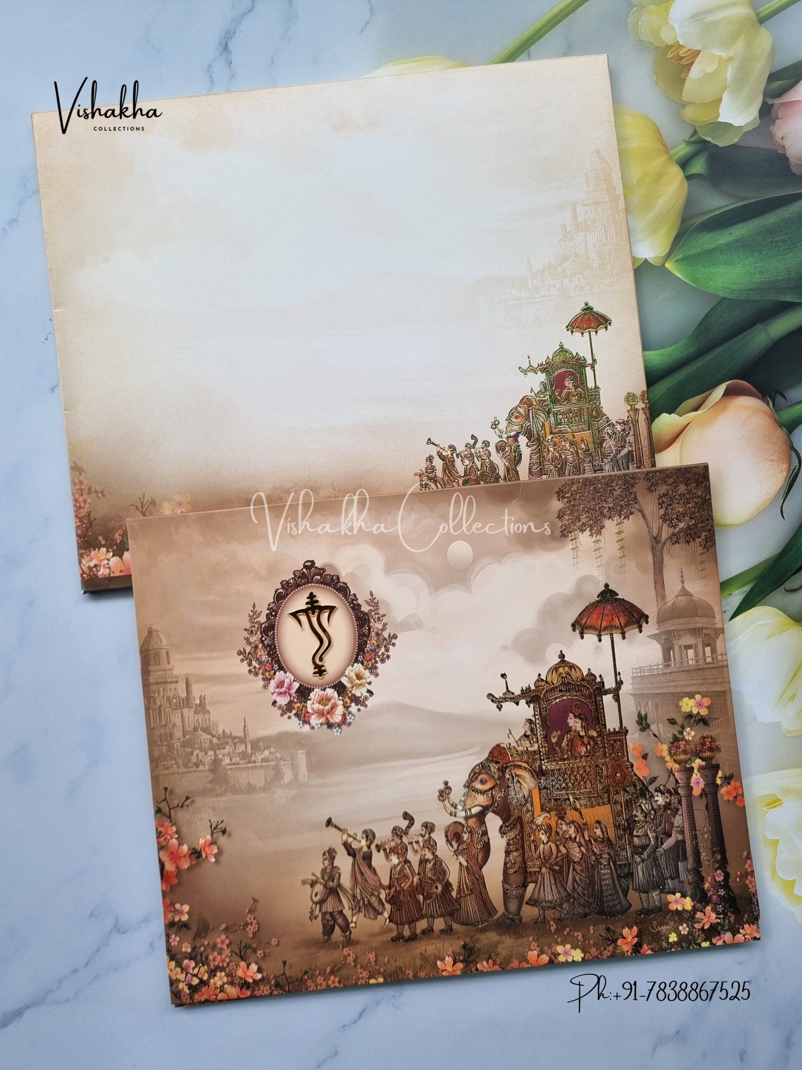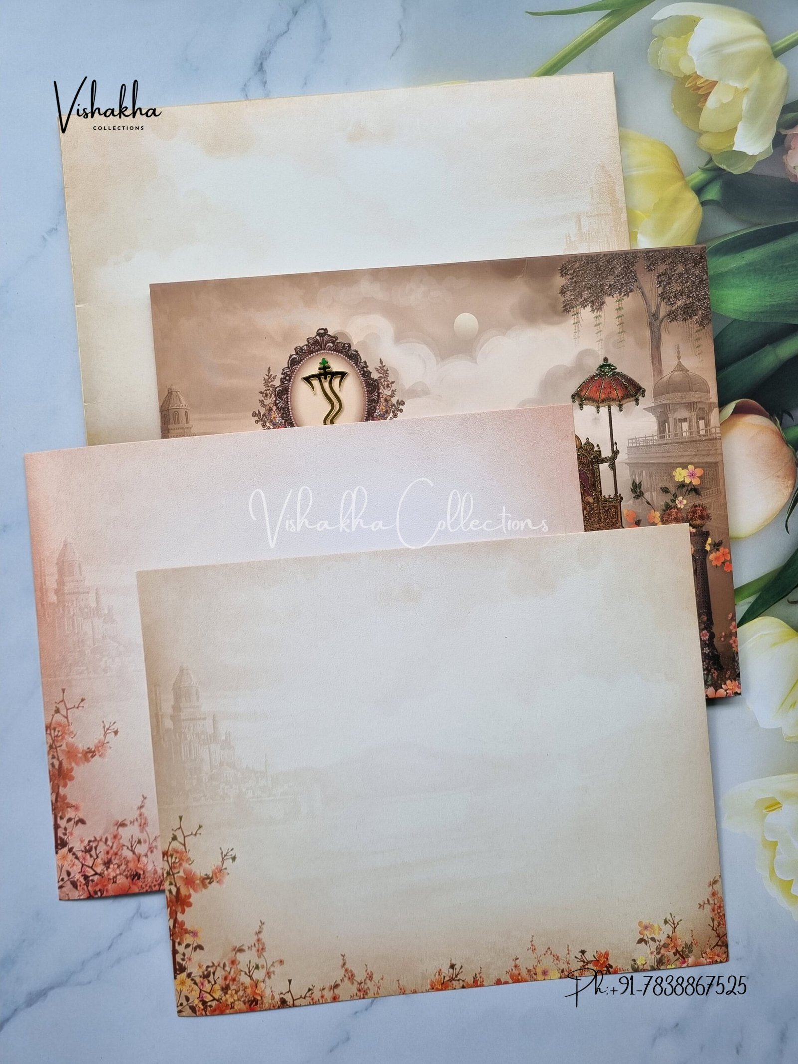 Vishakha Collections presents you beautiful luxury wedding invitation cards with all latest designs and the latest variety. Its just not a wedding invitation card but a beautiful feeling of love and relationship it carries for you. Beautifully printed and packed with a bundle of love. if you like it, dont think again, just go for it.If you are worrying about the quality of the product, send your doubts to us. We are here to help you. If you want in wholesale or bulk, dont forget to contact us.