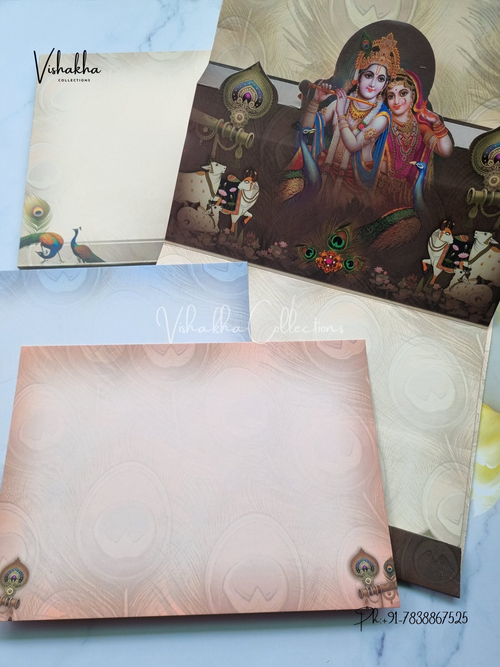 Vishakha Collections presents you beautiful luxury wedding invitation cards with all latest designs and the latest variety. Its just not a wedding invitation card but a beautiful feeling of love and relationship it carries for you. Beautifully printed and packed with a bundle of love. if you like it, dont think again, just go for it.If you are worrying about the quality of the product, send your doubts to us. We are here to help you. If you want in wholesale or bulk, dont forget to contact us.