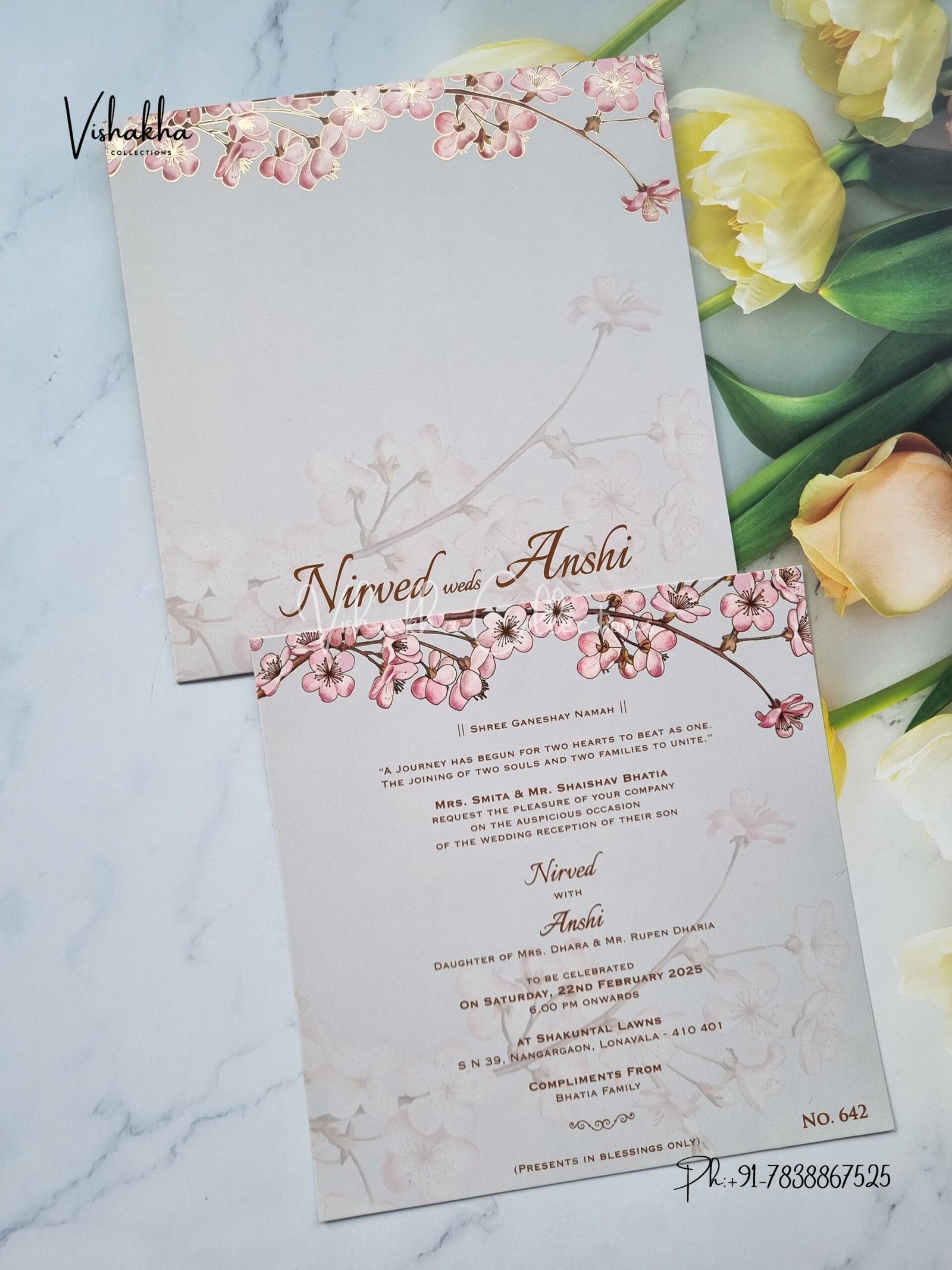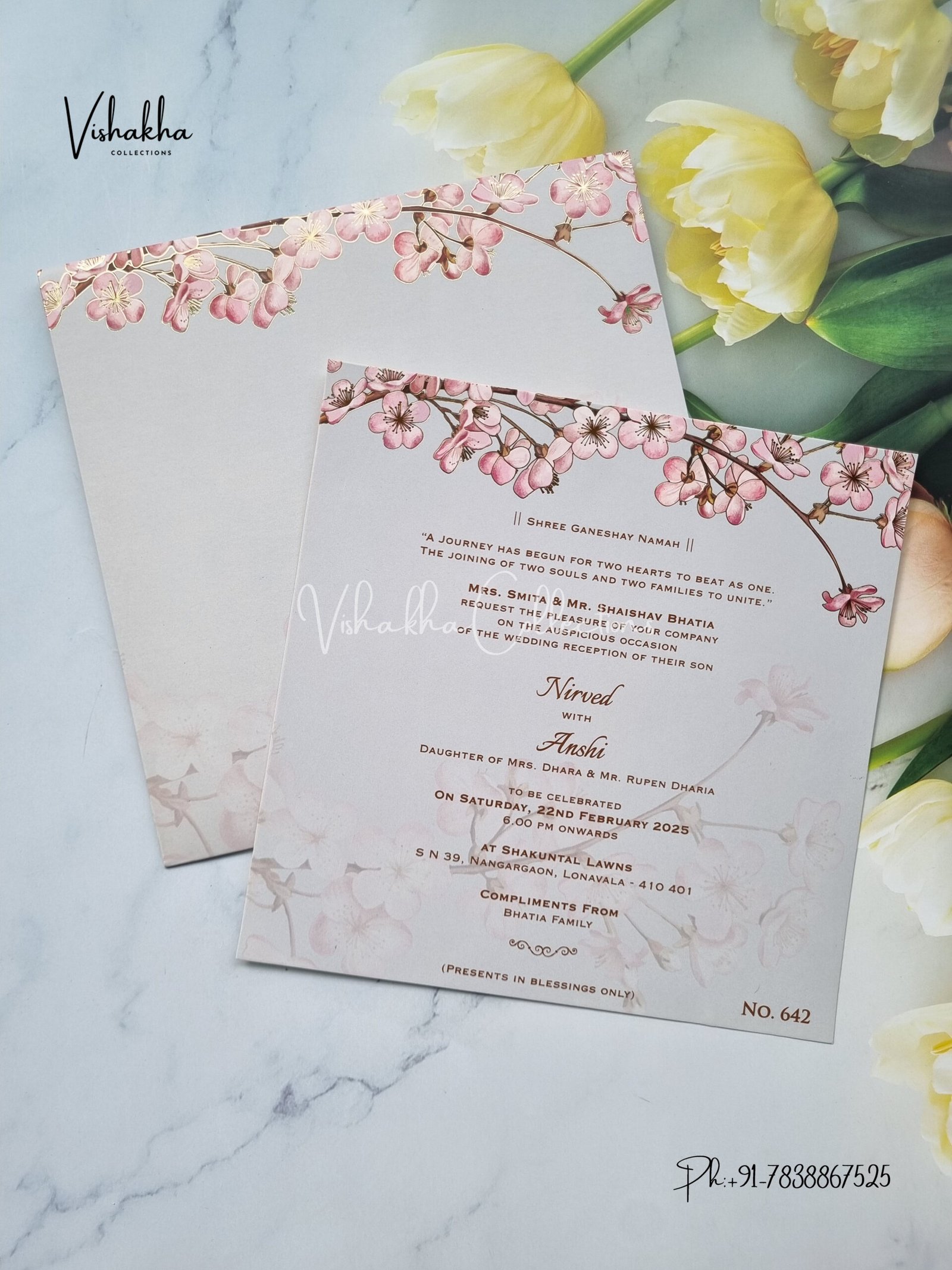 Vishakha Collections presents you beautiful luxury wedding invitation cards with all latest designs and the latest variety. Its just not a wedding invitation card but a beautiful feeling of love and relationship it carries for you. Beautifully printed and packed with a bundle of love. if you like it, dont think again, just go for it.If you are worrying about the quality of the product, send your doubts to us. We are here to help you. If you want in wholesale or bulk, dont forget to contact us.