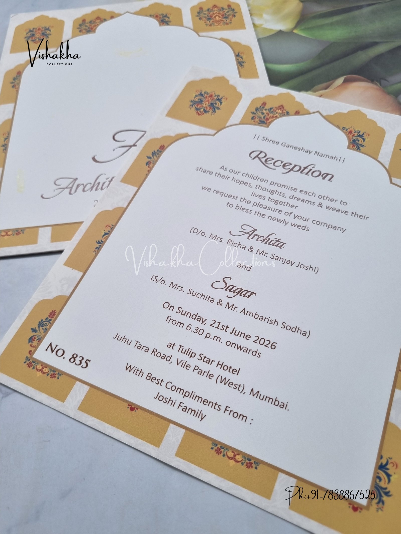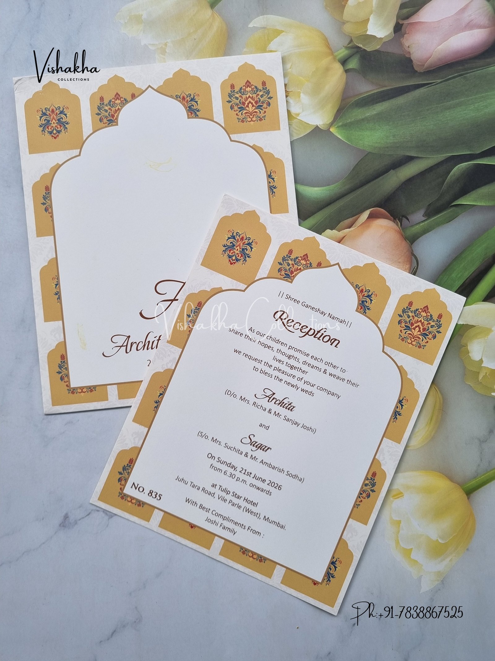 Vishakha Collections presents you beautiful luxury wedding invitation cards with all latest designs and the latest variety. Its just not a wedding invitation card but a beautiful feeling of love and relationship it carries for you. Beautifully printed and packed with a bundle of love. if you like it, dont think again, just go for it.If you are worrying about the quality of the product, send your doubts to us. We are here to help you. If you want in wholesale or bulk, dont forget to contact us.