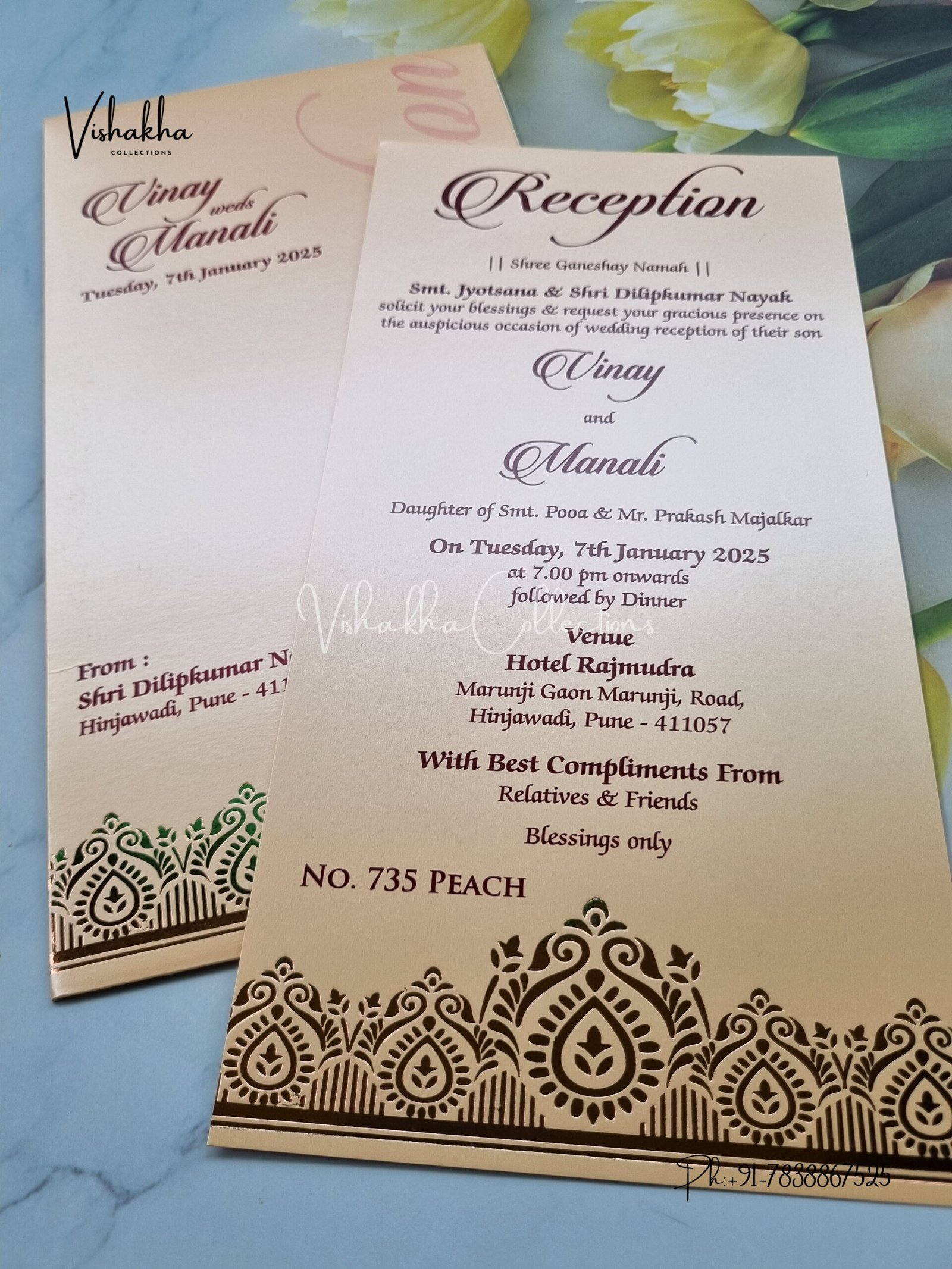 Vishakha Collections presents you beautiful luxury wedding invitation cards with all latest designs and the latest variety. Its just not a wedding invitation card but a beautiful feeling of love and relationship it carries for you. Beautifully printed and packed with a bundle of love. if you like it, dont think again, just go for it.If you are worrying about the quality of the product, send your doubts to us. We are here to help you. If you want in wholesale or bulk, dont forget to contact us.
