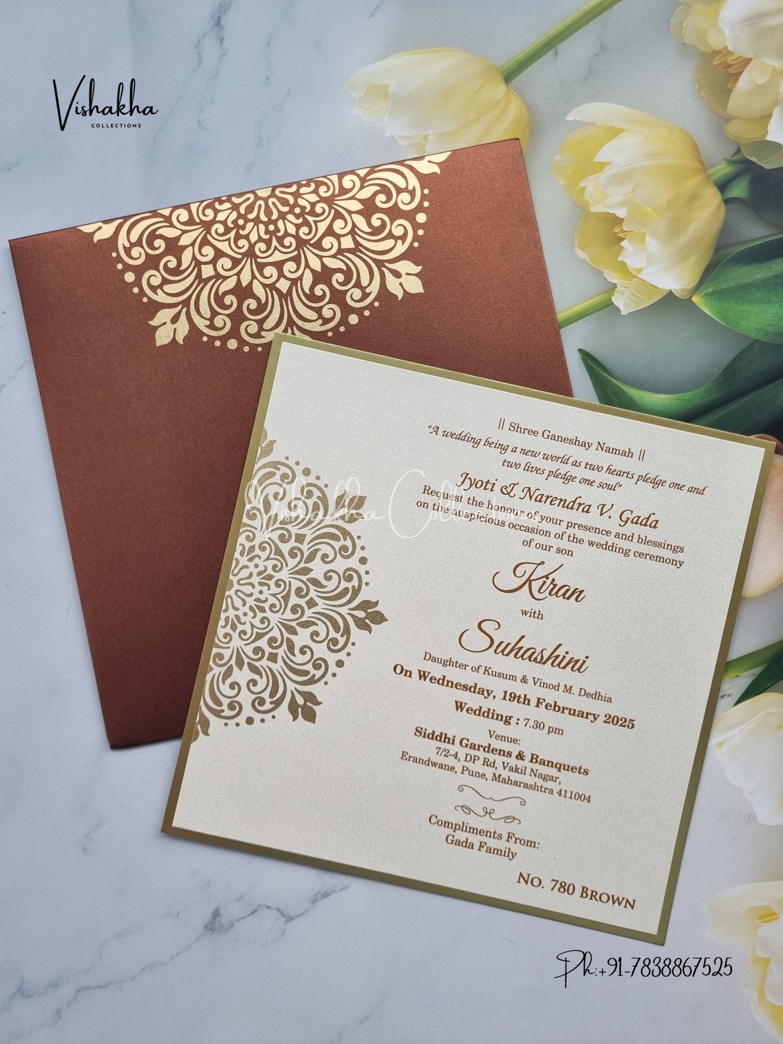 Vishakha Collections presents you beautiful luxury wedding invitation cards with all latest designs and the latest variety. Its just not a wedding invitation card but a beautiful feeling of love and relationship it carries for you. Beautifully printed and packed with a bundle of love. if you like it, dont think again, just go for it.If you are worrying about the quality of the product, send your doubts to us. We are here to help you. If you want in wholesale or bulk, dont forget to contact us.