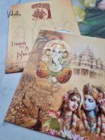 Be the first to review “Sita Ram Radha Krishna Ganesh Ji Hindu Orange Colored wedding invitation Cards NA-1125-4”