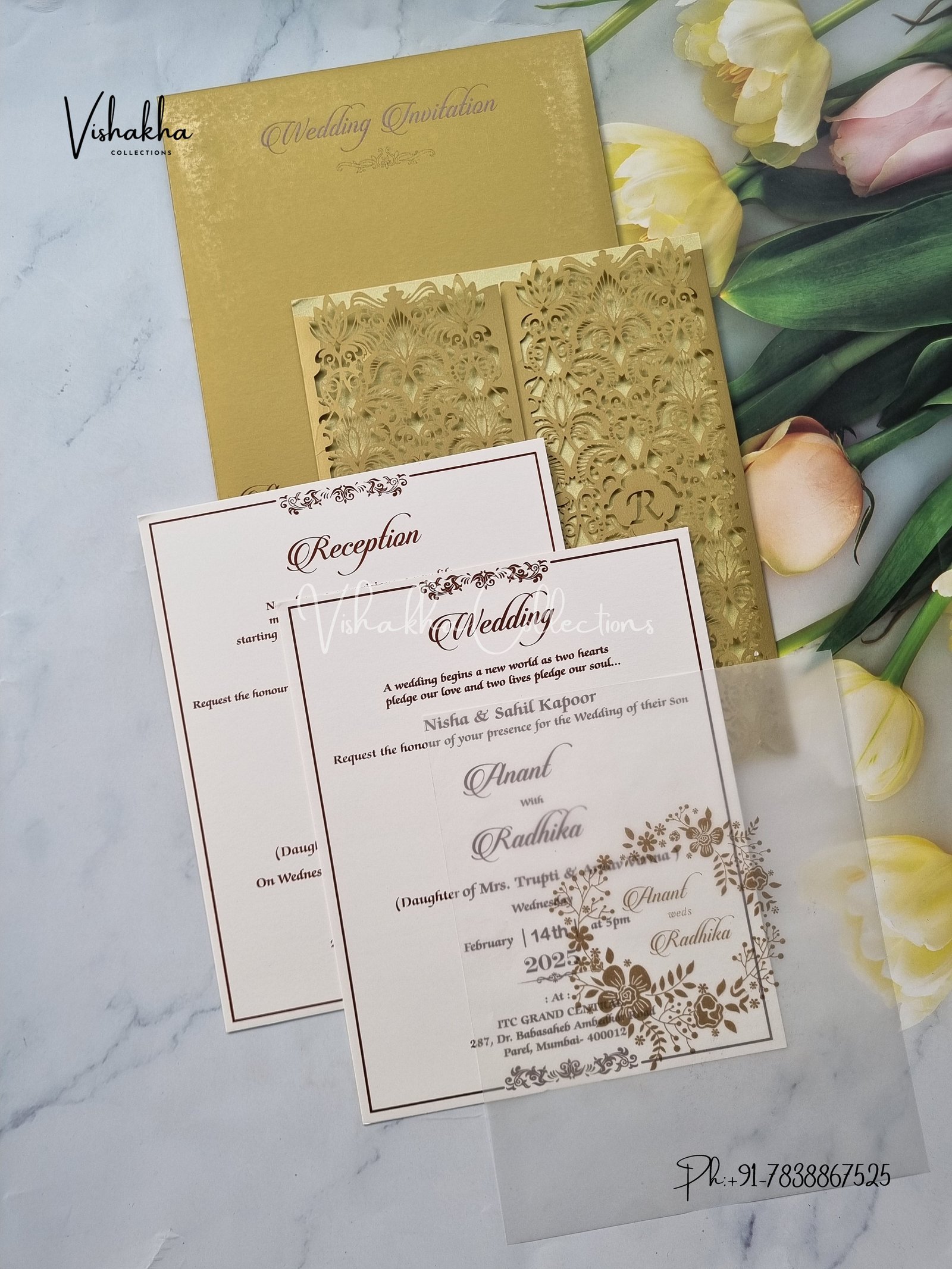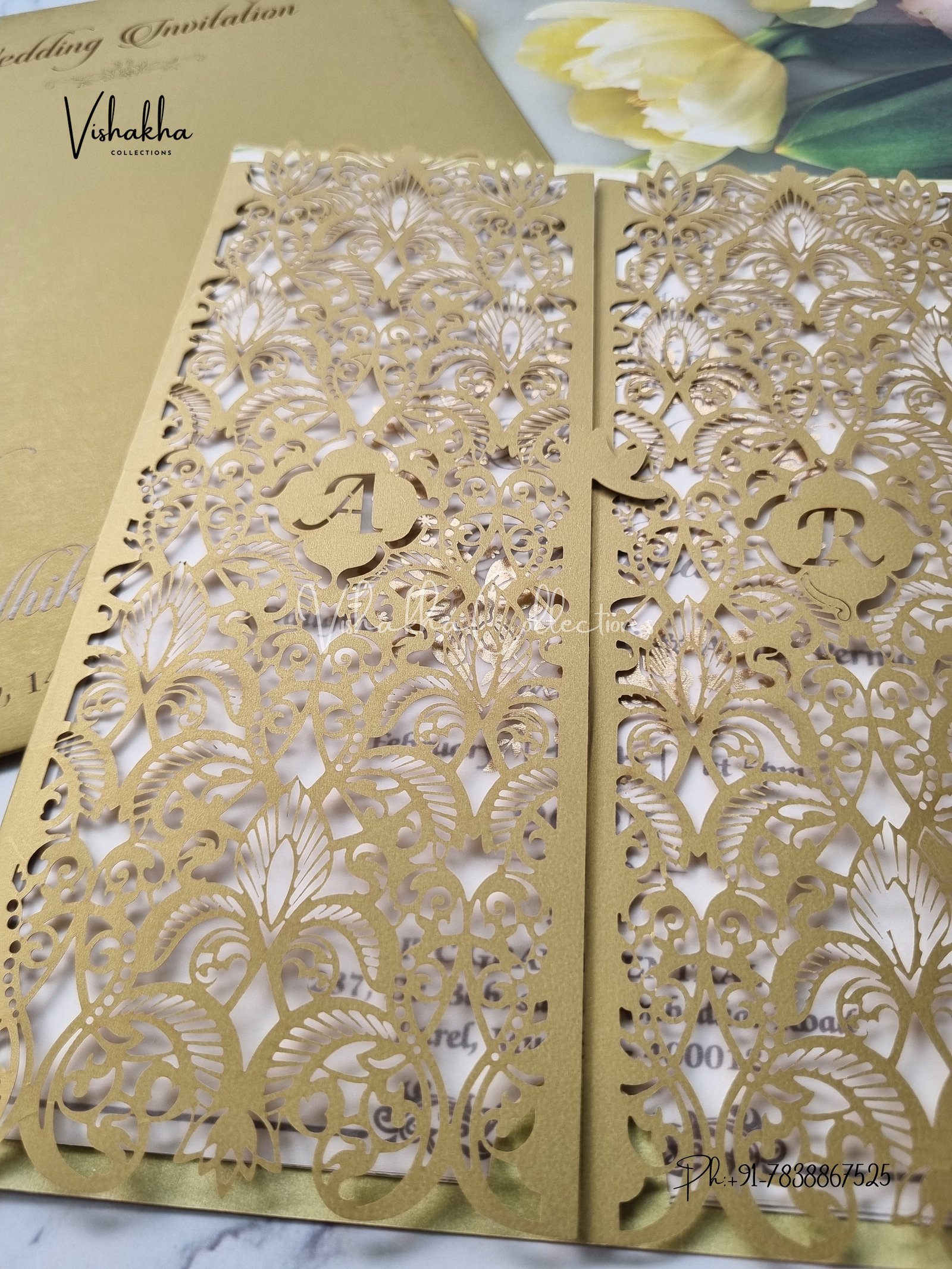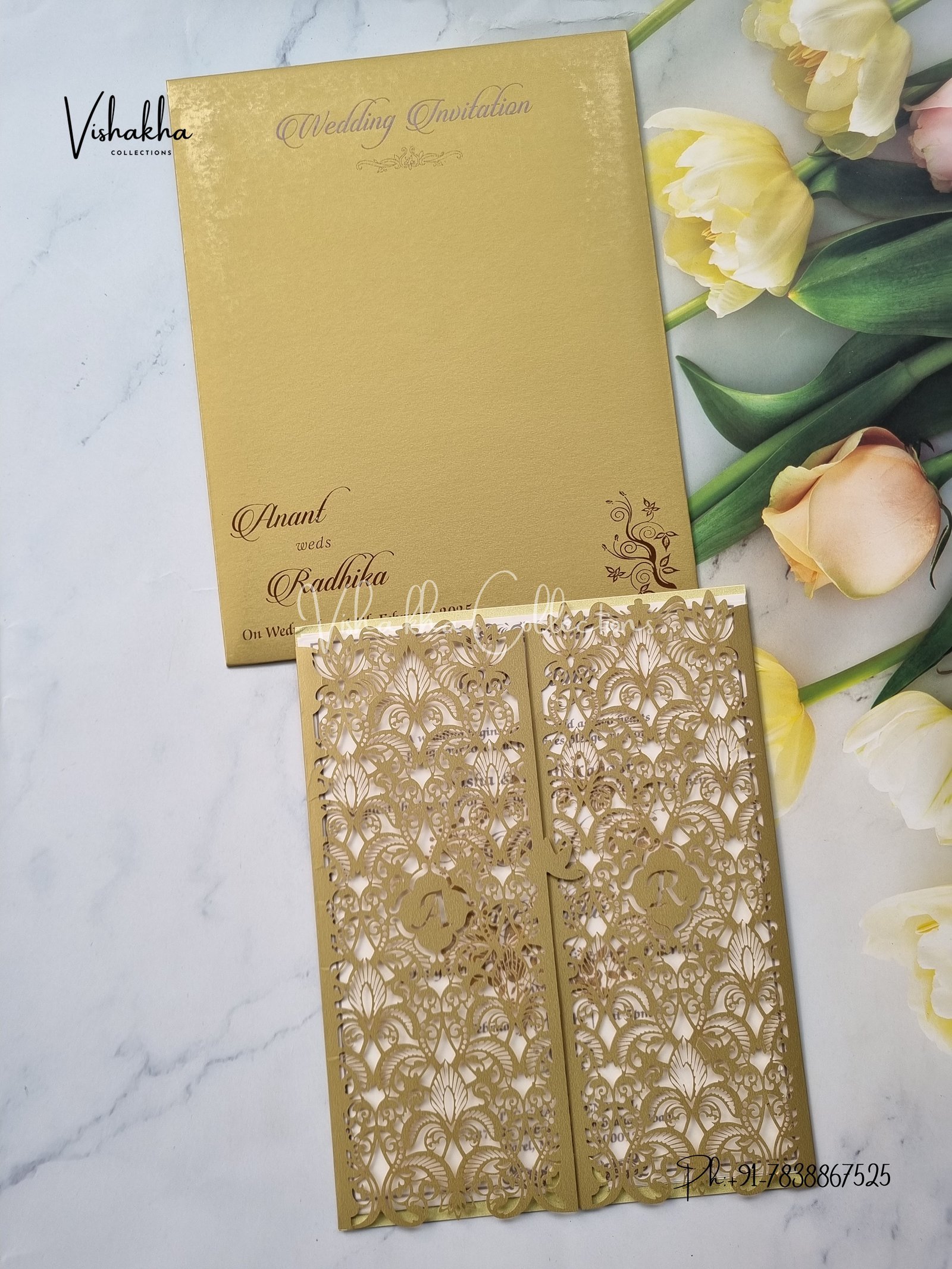 Vishakha Collections presents you beautiful luxury wedding invitation cards with all latest designs and the latest variety. Its just not a wedding invitation card but a beautiful feeling of love and relationship it carries for you. Beautifully printed and packed with a bundle of love. if you like it, dont think again, just go for it.If you are worrying about the quality of the product, send your doubts to us. We are here to help you. If you want in wholesale or bulk, dont forget to contact us.