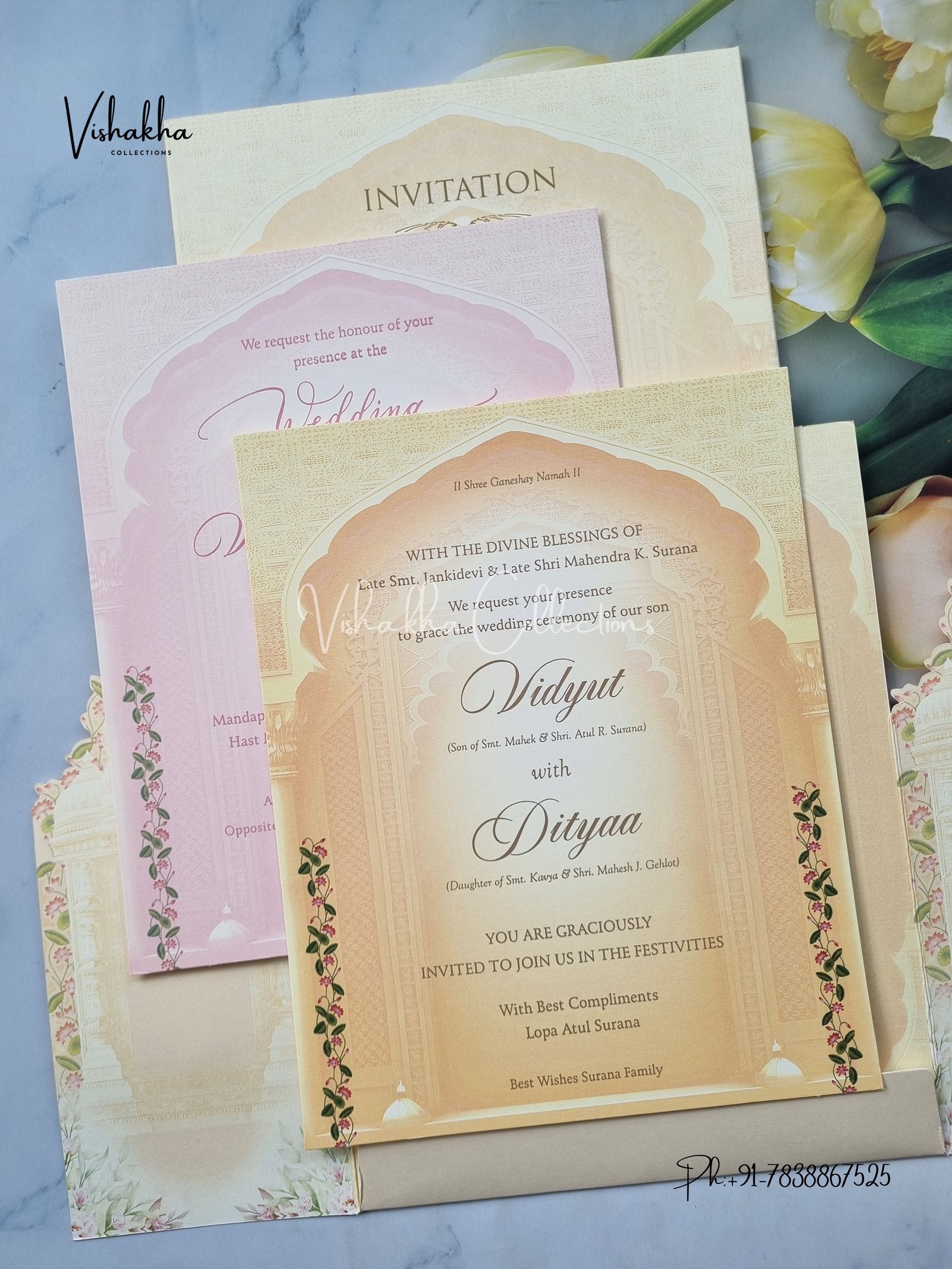Vishakha Collections presents you beautiful luxury wedding invitation cards with all latest designs and the latest variety. Its just not a wedding invitation card but a beautiful feeling of love and relationship it carries for you. Beautifully printed and packed with a bundle of love. if you like it, dont think again, just go for it.If you are worrying about the quality of the product, send your doubts to us. We are here to help you. If you want in wholesale or bulk, dont forget to contact us.
